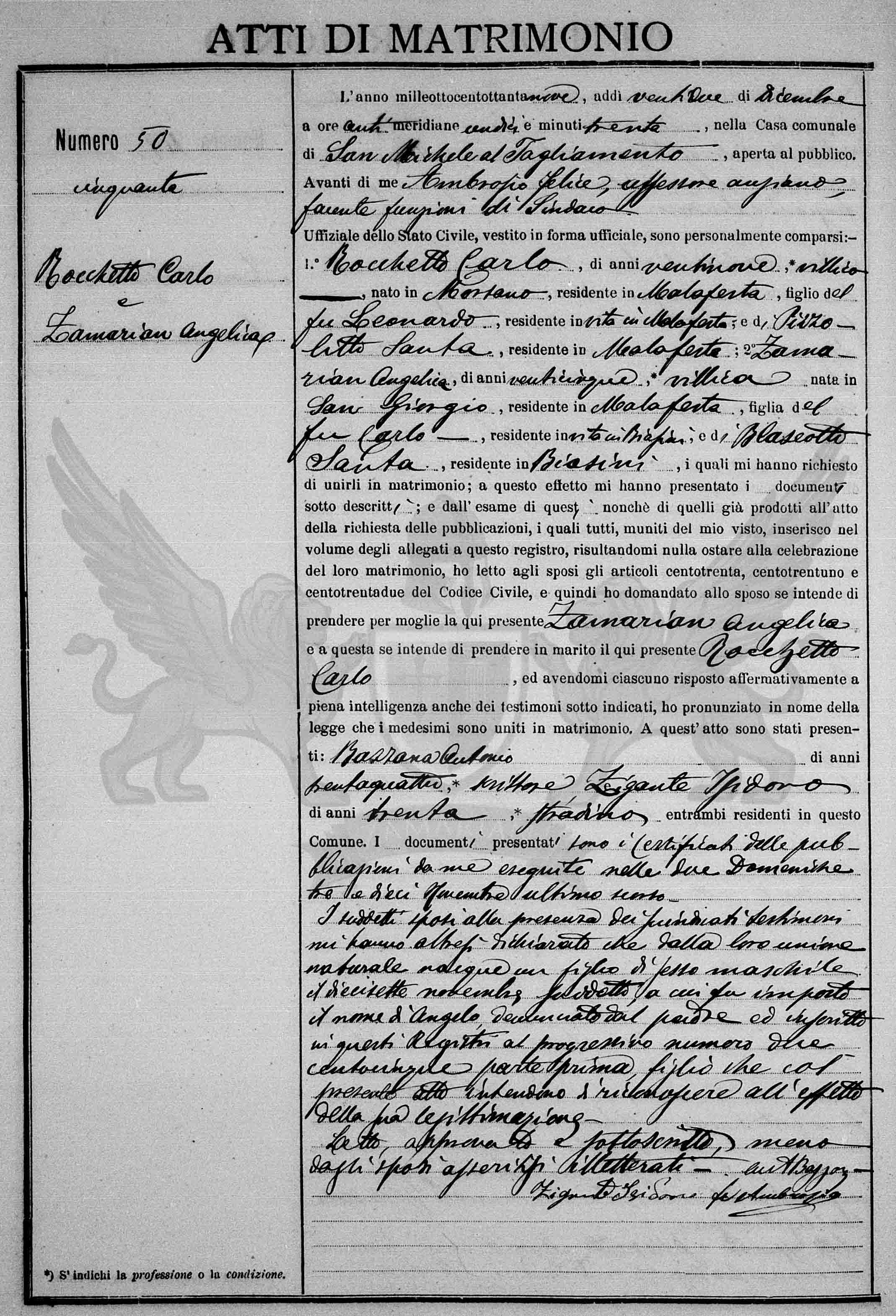 Diante de mim Ambrosio Felice, assessor mais antigo fazendo funções de Síndico Oficial do Estado Civil, vestido em forma oficial, pessoalmente compareceram: 1º Rocchetto Carlo, de vinte e nove anos, *camponês, nascido em Morsano, residente em Malafesta, filho do falecido Leonardo, residente em vida em Malafesta, e de Pizzolitto Santa, residente em Malafesta; 2º Zamarian Angelica de vinte e cinco anos, *camponesa nascida em San Giorgio, residente em Malafesta, filha do falecido Carlo, residente em vida em Biasini, e de Blaseotto Santa, residente em Biasini, os quais me solicitaram de uni-los em matrimônio; a este efeito me apresentaram os documentos abaixo descritos; e do exame destes e também daqueles já produzidos no ato da solicitação das publicações, os quais todos munidos do meu visto, inseri no volume dos anexos a este registro, resultando-me nada a impedir a celebração do matrimônio deles, li aos nubentes os artigos cento e trinta, cento e trinta e um e cento e trinta e dois do Código Civil e então perguntei ao nubente se intende tomar por mulher a aqui presente Zamarian Angelica e a esta se intende de tomar por marido o aqui presente Rocchetto Carlo, e tendo cada um respondido de maneira afirmativa em plena inteligência inclusive diante das testemunhas sub indicadas, pronunciei em nome da lei que os nubentes foram unidos em matrimônio. A este ato estiveram presentes: Bazzana Antonio de trinta e quatro anos, *escriturário e Zigante Isidoro de trinta anos, *pavimentador ambos presentes residentes neste Município. Os documentos apresentados são os certificados das publicações por mim exibidas nos dois domingos três e dez de setembro último passado.