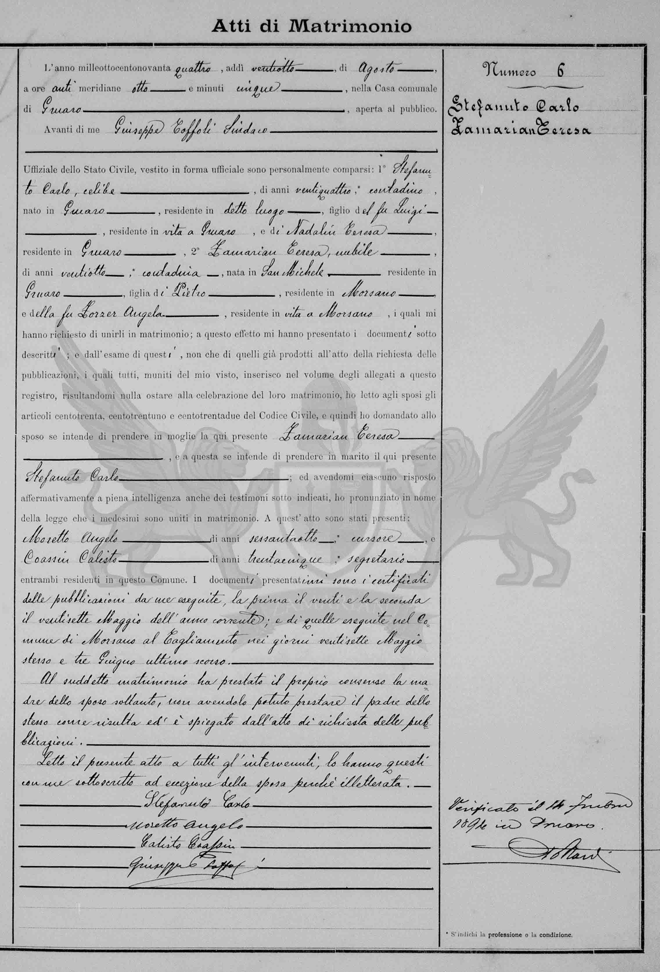 Diante de mim Giuseppe Toffoli Síndico, Oficial do Registro Civil, vestido em forma oficial, compareceram pessoalmente: 1º Stefanuto Carlo, solteiro, de vinte e quatro anos, *camponês, nascido em Gruaro, residente em Gruaro, filho do falecido Luigi, residente em vida em Gruaro, e de Nadalin Teresa, residente em Gruaro; 2º Zamarian Teresa de vinte e oito anos, *camponesa nascida em San Michele, residente em Gruaro, filha de Pietro, residente em Morsano, e da falecida Zorzer Angela, residente em vida em Morsano, os quais me pediram para uni-los em matrimônio; a este efeito me apresentaram os documentos abaixo descritos; e do exame destes também daqueles já produzidos no ato do requerimento das publicações, os quais todos munidos do meu visto, inseridos no volume dos anexos a este registro, resultando-me nada a impedir à celebração deste matrimônio, eu li aos nubentes os artigos cento e trinta, cento e trinta e um e cento e trinta e dois do Código Civil e então perguntei ao nubente se intende de tomar por mulher a aqui presente Zamarian Teresa e a esta se entende de tomar por marido o aqui presente Stefanuto Carlo, e havendo-me cada um respondido de maneira afirmativa em plena inteligência inclusive para as testemunhas sub indicadas , pronunciei em nome da lei que os referidos foram unidos em matrimônio. A este ato estavam presentes: Moretto Angelo de sessenta e oito anos, cursor e Coassin Calisto de trinta e cinco anos, *secretário ambos presentes residentes neste Município. Os documentos apresentados são os certificados das publicações por mim exibidas nos dias vinte e sete de maio e três de junho último passado.