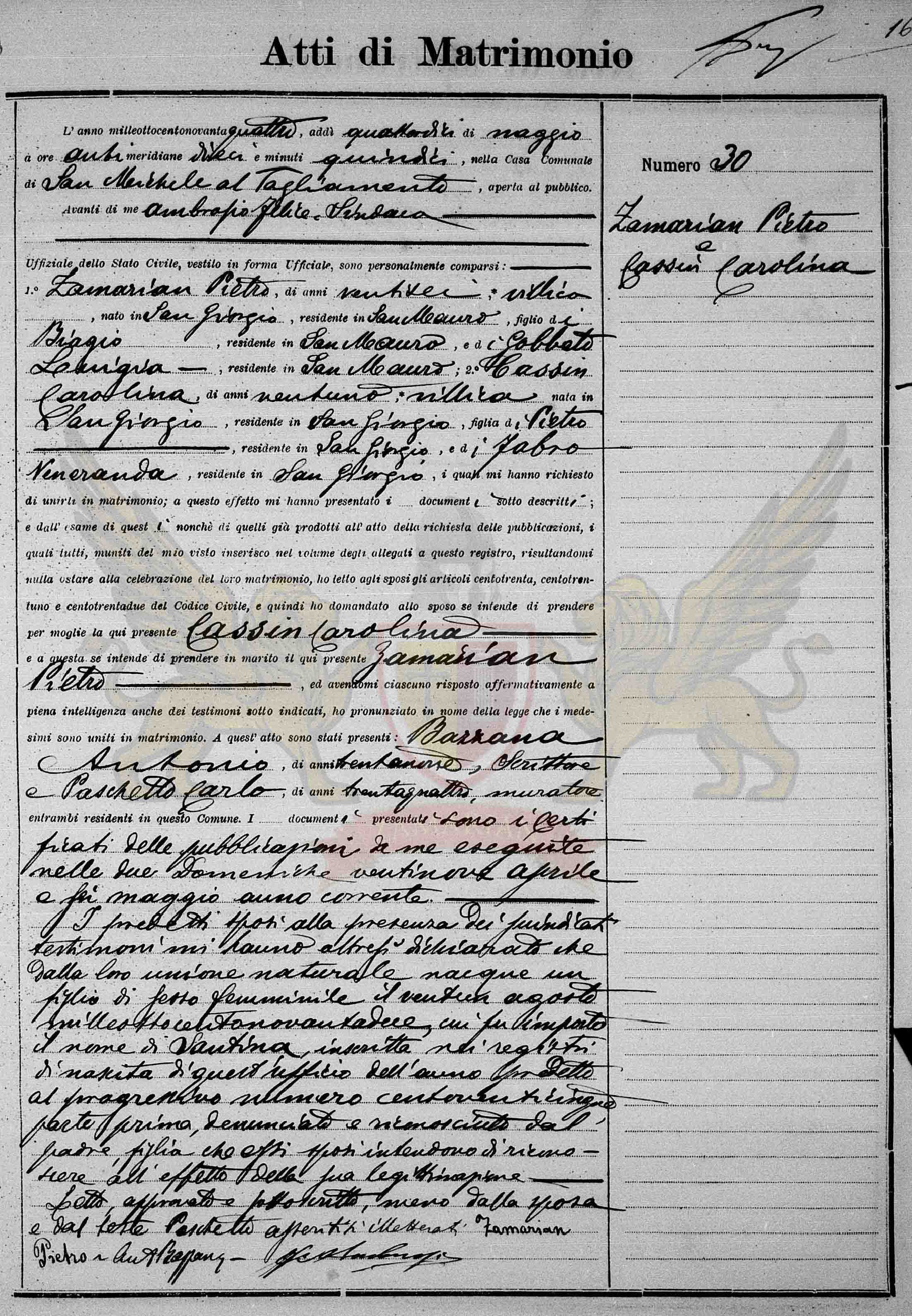 Diante de mim Ambrosio Felice Síndico Oficial do Registro Civil, vestido em forma oficial, compareceram pessoalmente: 1º Zamarian Pietro de vinte e seis anos, camponês, nascido em San Giorgio, residente em San Mauro, filho de Biagio, residente em San Mauro, e de Gobbatto Luigia, residente em San Mauro; 2º Cassin Carolina de vinte e um anos, camponesa nascida em San Giorgio, residente em San Giorgio, filha de Pietro, residente em San Giorgio, e de Fabbro Veneranda, residente em San Giorgio, os quais me pediram para uni-los em matrimônio; a este efeito me apresentaram os documentos abaixo descritos; e do exame destes também daqueles já produzidos no ato do requerimento das publicações, os quais todos munidos do meu visto, inseridos no volume dos anexos a este registro, resultando-me nada a impedir à celebração deste matrimônio, eu li aos nubentes os artigos cento e trinta, cento e trinta e um e cento e trinta e dois do Código Civil e então perguntei ao nubente se intende de tomar por mulher a aqui presente Cassin Carolina e a esta se entende de tomar por marido o aqui presente Zamarian Pietro, e havendo-me cada um respondido de maneira afirmativa em plena inteligência inclusive para as testemunhas sub indicadas , pronunciei em nome da lei que os referidos foram unidos em matrimônio. A este ato se apresentaram: Bazzana Antonio de trinta e nove anos, escriturário e Paschetto Carlo de trinta e quatro anos, construtor ambos presentes residentes neste Município. Os documentos apresentados são os certificados das publicações por mim exibidas nos dois domingos vinte e nove de abril e seis de maio do ano corrente.