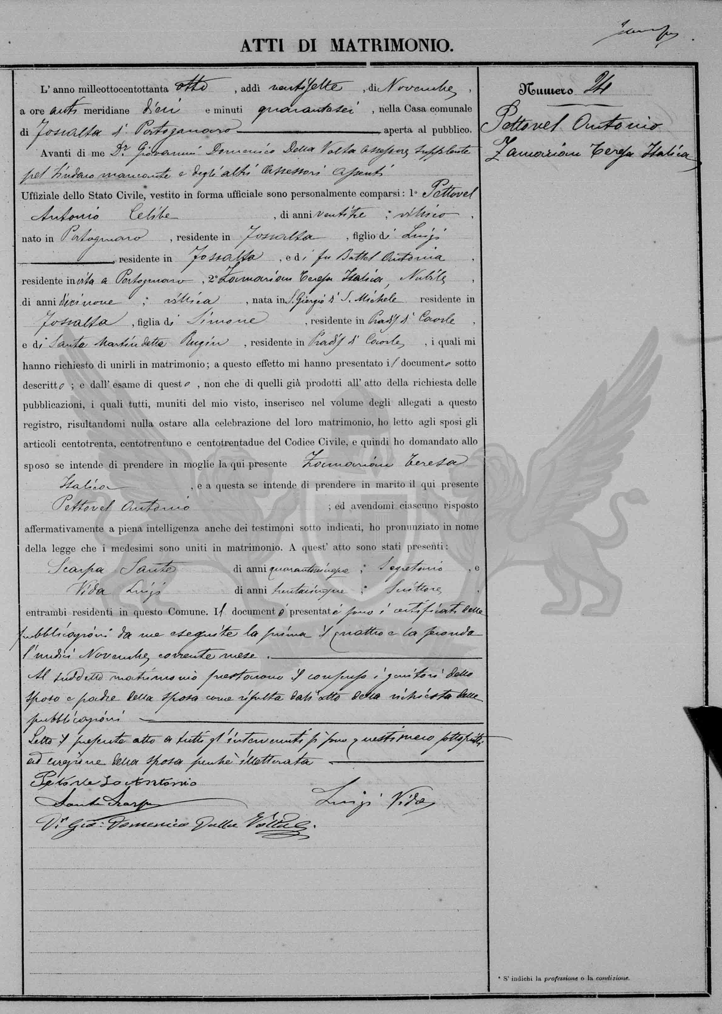 Diante de mim Dr. Giovanni Domenico Della Valsa Assessor Suplente pelo Síndico faltante e dos assessores ausentes Oficial do Registro Civil, vestido em forma oficial, compareceram pessoalmente: 1º Pettovel Antonio, solteiro, de vinte e três anos, camponês, nascido em Portogruaro, residente em Fossalta, filho de Luigi, residente em Fossalta, e da finada Battel Antonia, residente em vida em Portogruaro; 2º Zamarian Teresa Italica de dezenove anos, camponesa nascida em San Giorgio de San Michele, residente em Fossalta, filha de Simone, residente em Pradis de Caorle, e Santa Martin dita Rugin, residente em Pradis de Caorle, residente em Pradis de Caorle, os quais me pediram para uni-los em matrimônio; a este efeito me apresentaram o documento abaixo descrito; e do exame deste também daqueles já produzidos no ato do requerimento das publicações, os quais todos munidos do meu visto, inseridos no volume dos anexos a este registro, resultando-me nada a impedir à celebração deste matrimônio, eu li aos nubentes os artigos cento e trinta, cento e trinta e um e cento e trinta e dois do Código Civil e então perguntei ao nubente se intende de tomar por mulher a aqui presente Zamarian Teresa Italica e a esta se entende de tomar por marido o aqui presente Pettovel Antonio, e havendo-me cada um respondido de maneira afirmativa em plena inteligência inclusive para as testemunhas sub indicadas , pronunciei em nome da lei que os referidos foram unidos em matrimônio. A este ato se apresentaram: Scarpa Sante de quarenta e cinco anos, Secretário e Vida Luigi de trinta e cinco anos, *Escritor ambos presentes residentes neste Município. O documento apresentado é o certificado das publicações por mim exibidas o primeiro quatro e o segundo onze de novembro do corrente mês.