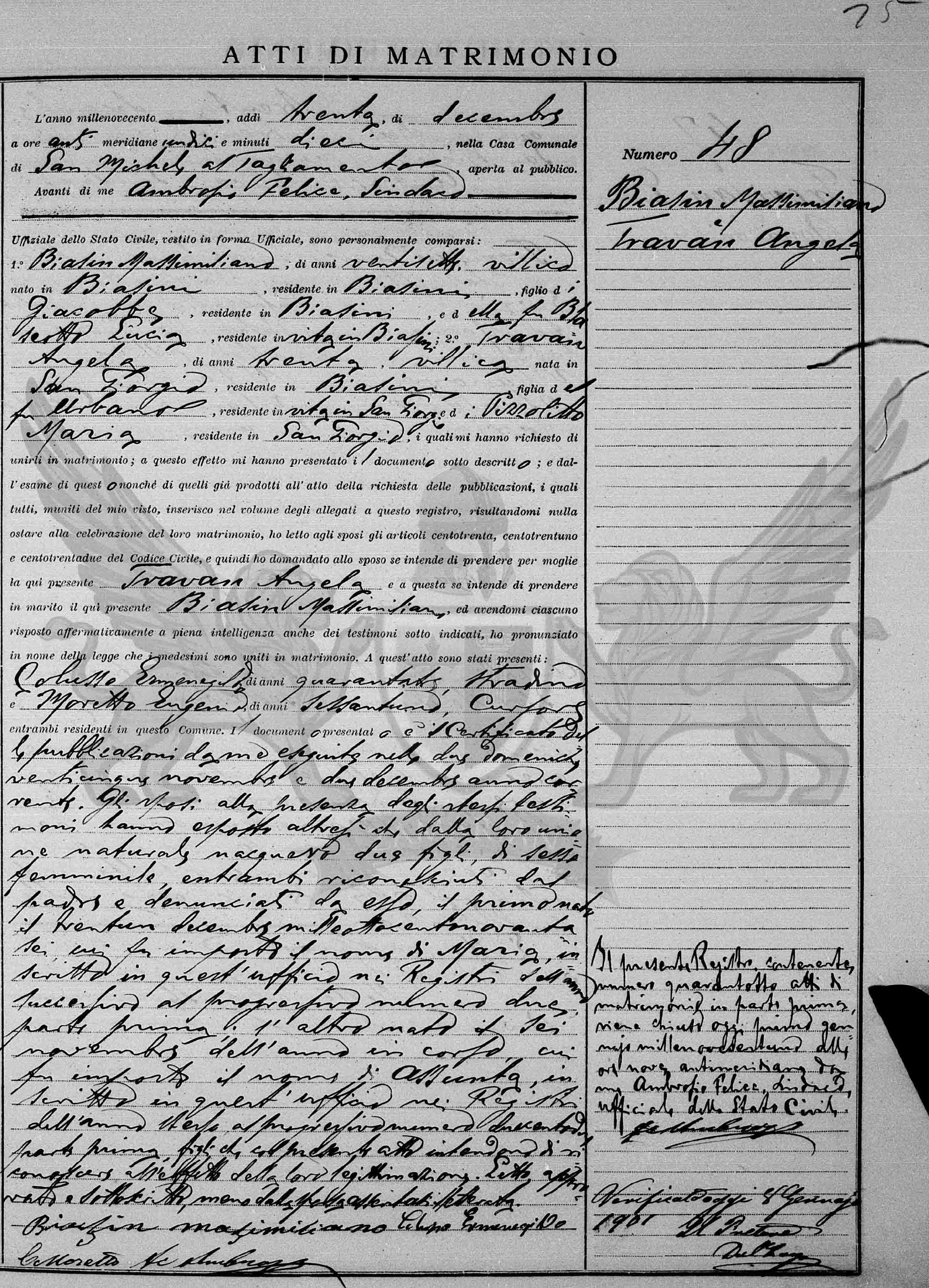 Diante de mim Ambrosio Felice Síndico Oficial do Estado Civil, vestido em forma oficial, compareceram pessoalmente: 1º Biasin Massimiliano, *camponês, nascido em Biasini, residente em Biasini, filho de Giacobbe, residente em Biasini, e da falecida Blaseotto Lucia, residente em vida em Biasini; 2º Travan Angela, de trinta anos, *camponesa nascida em San Giorgio, residente em Biasini, filha do do falecido Urbano, residente em vida em San Giorgio, e de Pizzolitto Maria, residente em San Giorgio, os quais me pediram para uni-los em matrimônio; a este efeito me apresentaram o documento abaixo descrito; e do exame deste também daqueles já produzidos no ato do requerimento das publicações, os quais todos munidos do meu visto, inseridos no volume dos anexos a este registro, resultando-me nada a impedir à celebração deste matrimônio, eu li aos nubentes os artigos cento e trinta, cento e trinta e um e cento e trinta e dois do Código Civil e então perguntei ao nubente se intende de tomar por mulher a aqui presente Travan Angela e a esta se entende de tomar por marido o aqui presente Biasini Massimiliano, e havendo-me cada um respondido de maneira afirmativa em plena inteligência inclusive para as testemunhas sub indicadas , pronunciei em nome da lei que os referidos foram unidos em matrimônio. A este ato estavam presentes: Colusso Ermenegildo de quarenta e três anos, *pavimentador e Moretto Eugenio de sessenta e um anos, *cursor, ambos presentes residentes neste Município. O documentos apresentado é o certificado das publicações por mim exibidas nos dois domingos vinte e cinco de novembro e dois de dezembro do ano corrente.