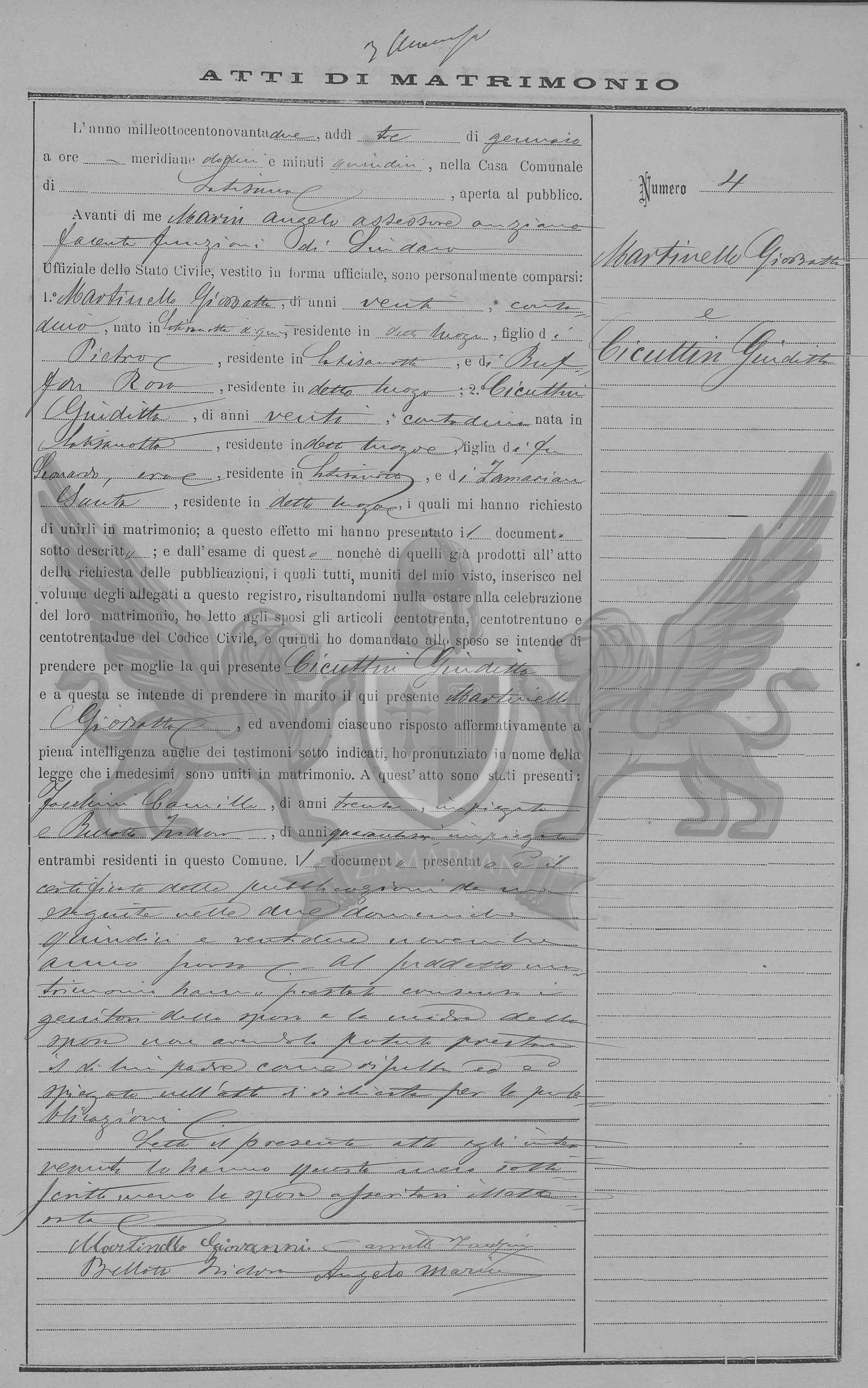 Diante de mim Marin Angelo assessor ancião fazendo as funções do Síndico Oficial do Registro Civil, vestido em forma oficial, compareceram pessoalmente: 1º Martinello Gio Batta de vinte anos, camponês, nascido em Latisana daqui, residente no citado local, filho de Pietro, residente em Latisanotta, e de Buffon Rosa, residente no citado local; 2º Cicuttin Giuditta de vinte anos, camponesa nascida em Latisanotta, residente em no citado local, filha do finado Leonardo, era, residente em Latisanotta, e Zamarian Santa, residente no citado local, os quais me pediram para uni-los em matrimônio; a este efeito me apresentaram o documento abaixo descrito; e do exame deste também daqueles já produzidos no ato do requerimento das publicações, os quais todos munidos do meu visto, inseridos no volume dos anexos a este registro, resultando-me nada a impedir à celebração deste matrimônio, eu li aos nubentes os artigos cento e trinta, cento e trinta e um e cento e trinta e dois do Código Civil e então perguntei ao nubente se intende de tomar por mulher a aqui presente Cicuttin Giuditta e a esta se entende de tomar por marido o aqui presente Martinello Gio Batta, e havendo-me cada um respondido de maneira afirmativa em plena inteligência inclusive para as testemunhas sub indicadas , pronunciei em nome da lei que os referidos foram unidos em matrimônio. A este ato se apresentaram: Facchin Camillo de trinta anos, empregado e Belotto Isidoro de quarenta e quatro anos, empregado ambos presentes residentes neste Município.