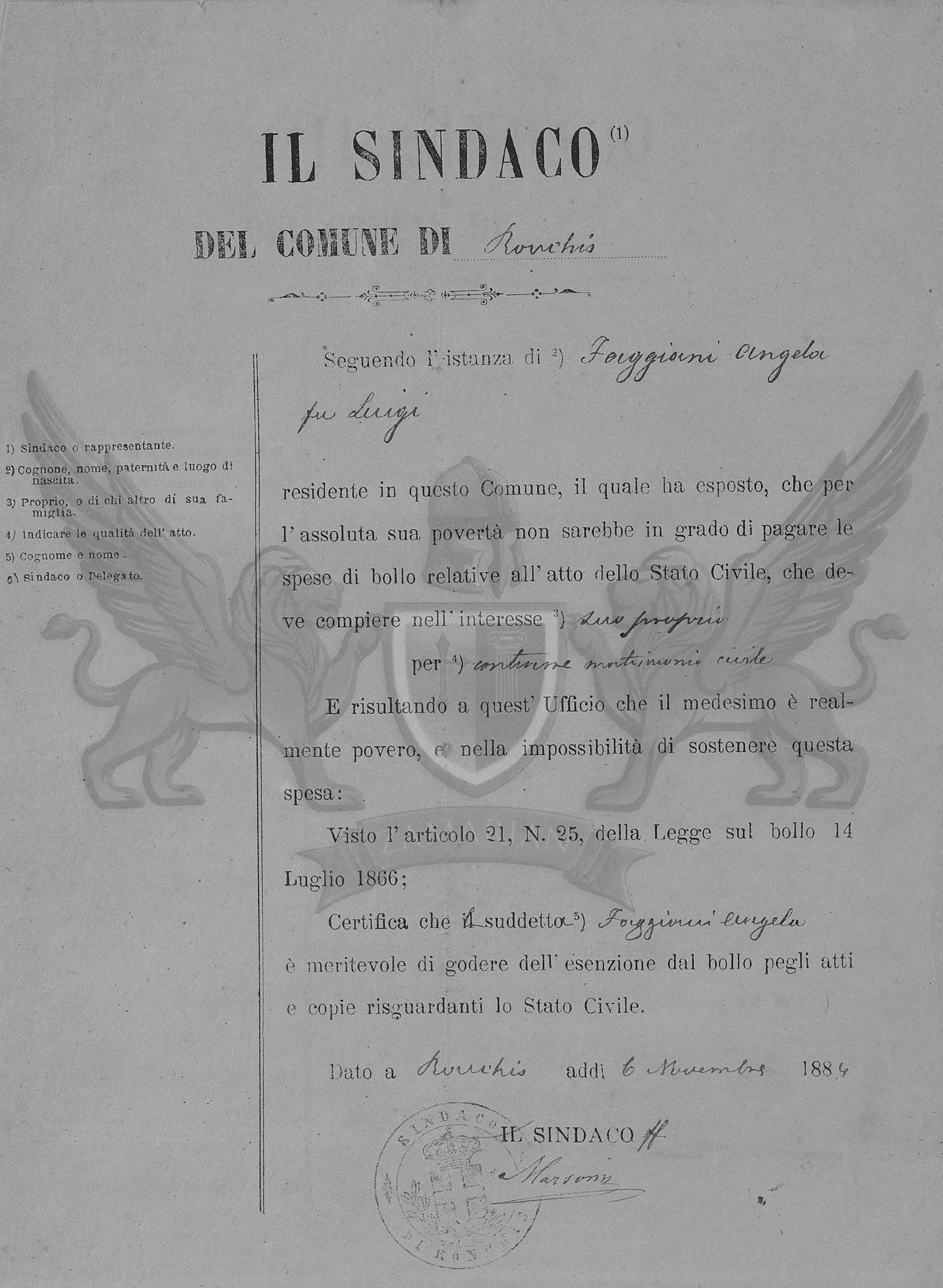 Seguindo a instância de 2 ) Faggiani Angela filha do finado Luigi residente neste Município, a qual expôs, que para a absoluta sua pobreza não estaria em condições de pagar as despesas de taxa relativas ao ato do Estado Civil, que deve cumprir no interesse 3 ) seu próprio para 4 ) contrair matrimônio civil.