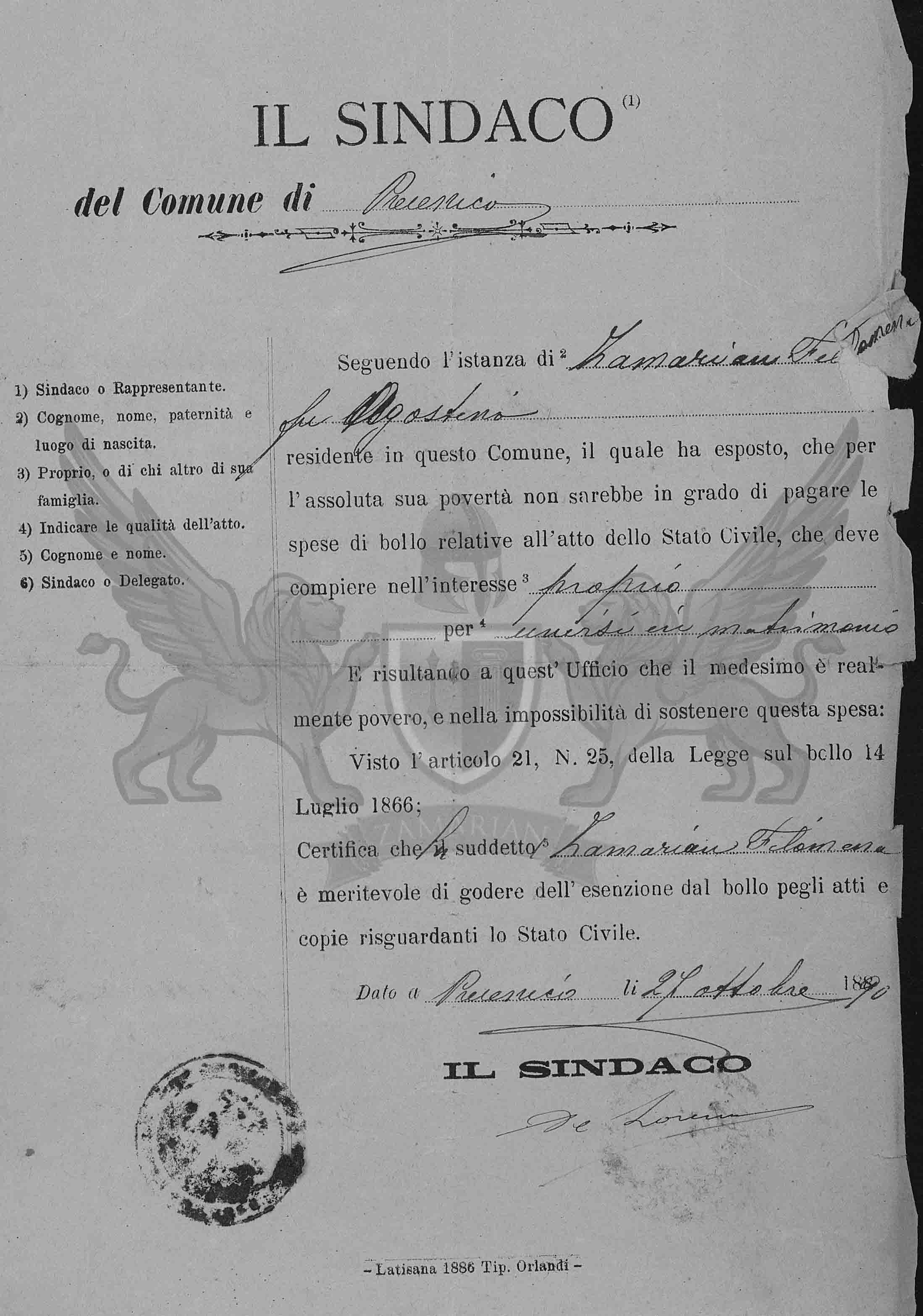 Seguindo a instância de 2 ) Zamarian Filomena filha de Agostino residente neste Município, a qual expôs, que para a absoluta sua pobreza não estaria em condições de pagar as despesas de taxa relativas ao ato do Estado Civil, que deve cumprir no interesse 3 ) seu próprio para 4 ) contrair matrimônio civil.