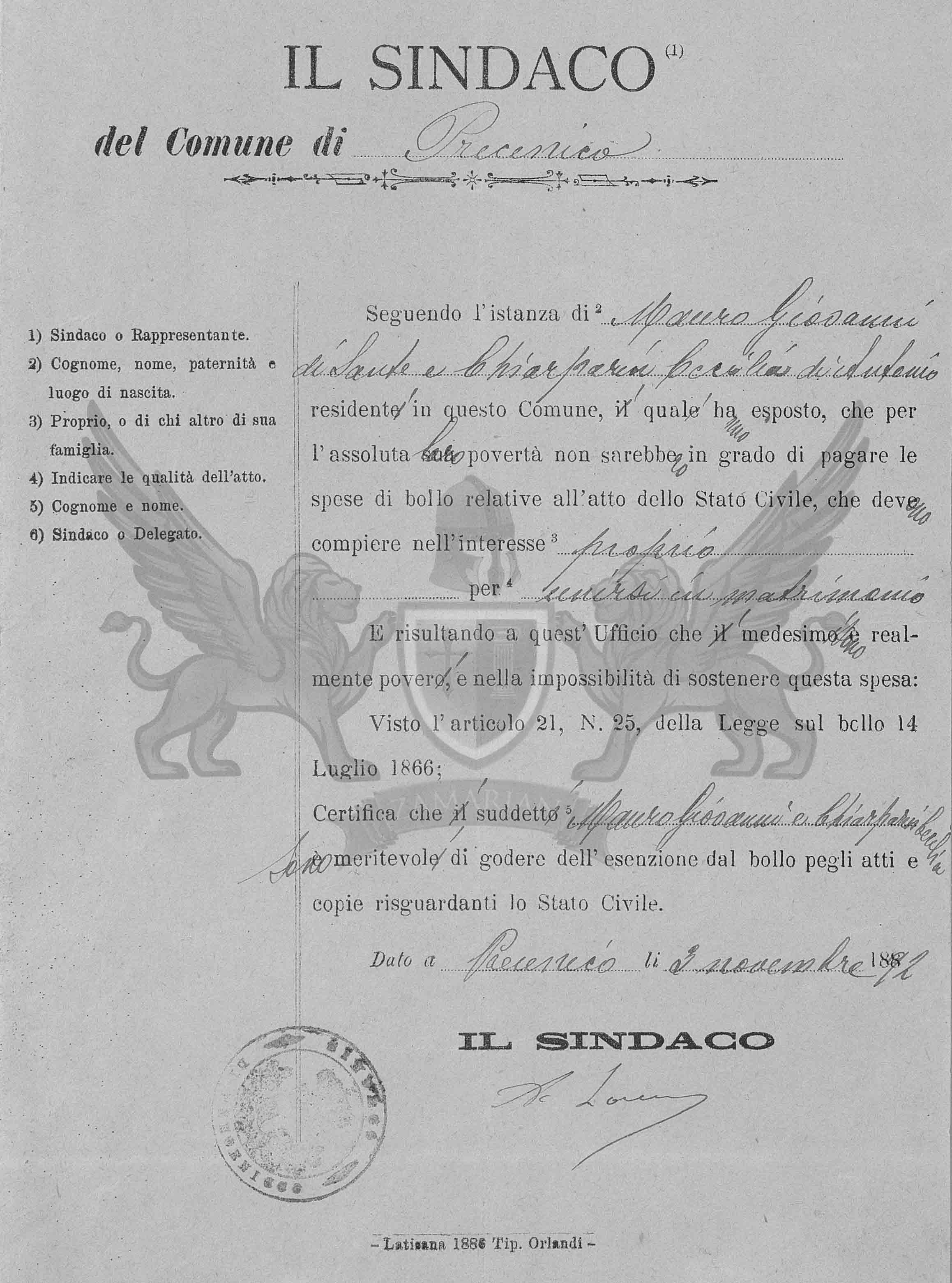 Dado em Precenicco ao dia 3 de novembro de 1892