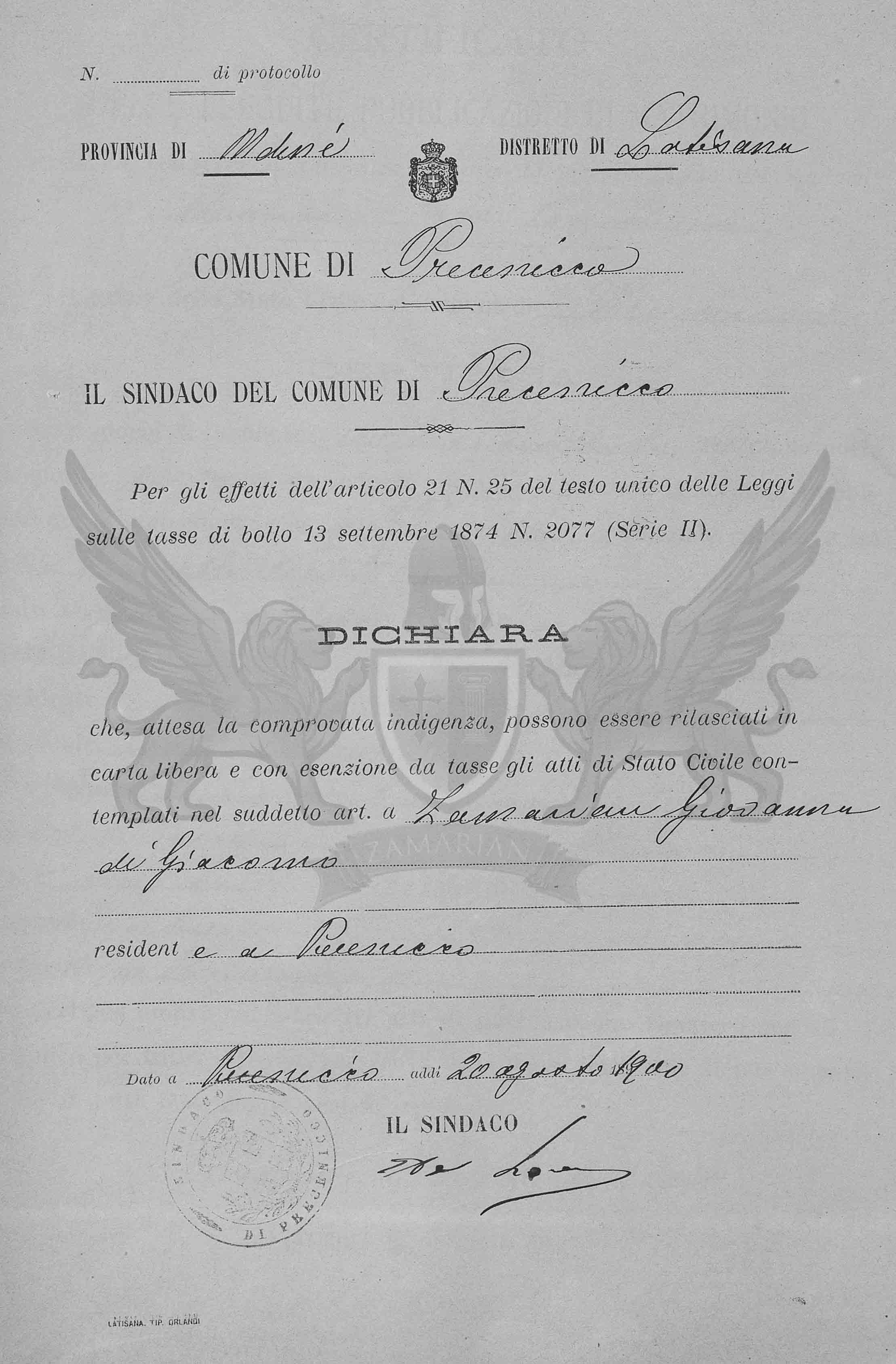 Dado em Precenicco aos dias 20 de agosto de 1900