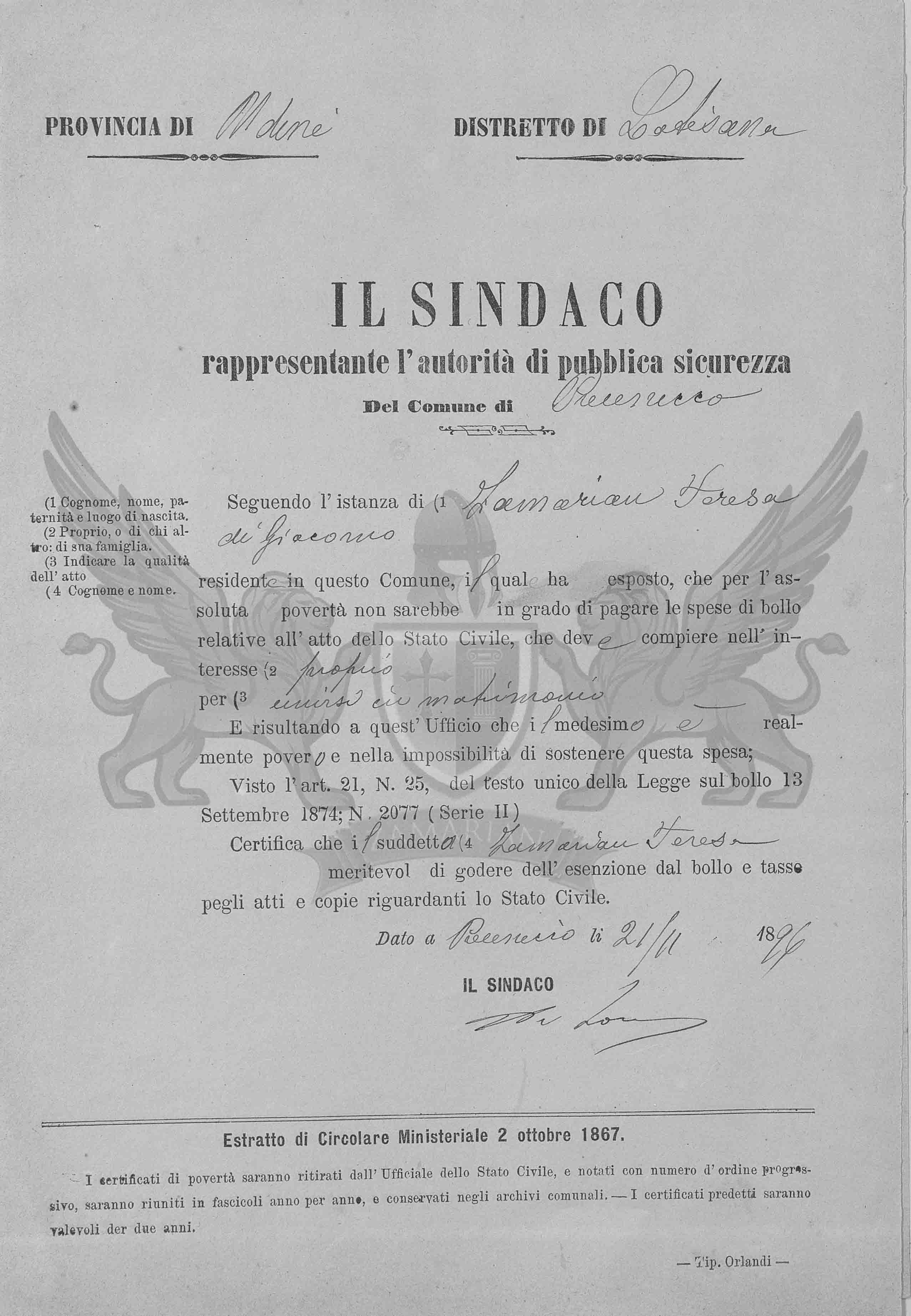Seguindo a instância de 1 ) Zamarian Teresa filha de Giacomo residente neste Município, a qual expôs, que para a absoluta sua pobreza não estaria em condições de pagar as despesas de taxa relativas ao ato do Estado Civil, que deve cumprir no interesse 2 ) seu próprio para 3 ) contrair matrimônio civil.