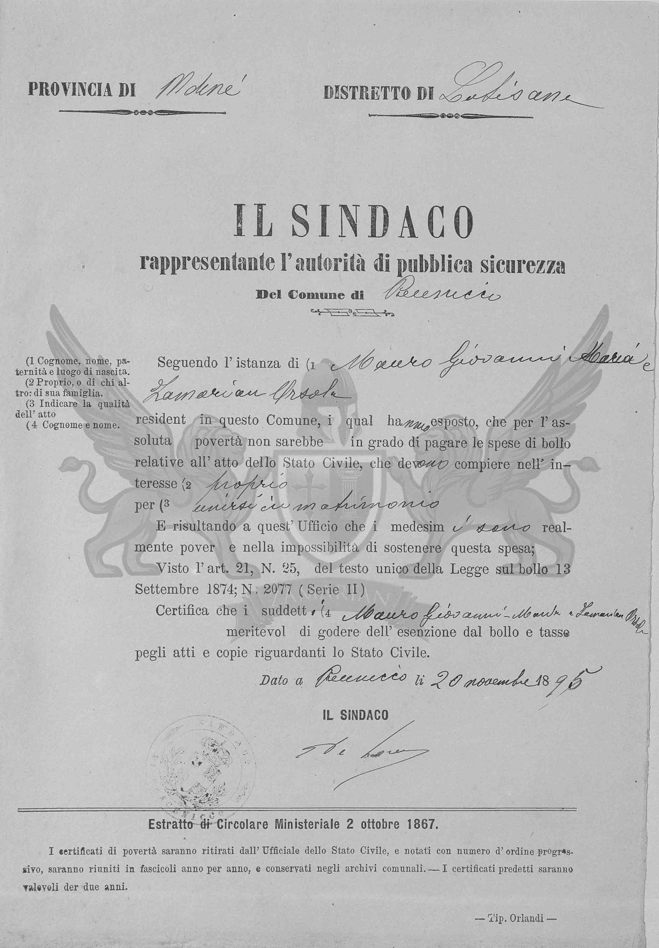 Seguindo a instância de 1 ) Mauro Giovanni Maria e Zamarian Orsola residentes neste Município, os quais expuseram, que pela absoluta pobreza não estariam em condições de pagar as despesas de taxa relativas ao ato do Estado Civil, que deve cumprir no interesse 2 ) seu próprio para 3 ) unir-se em matrimônio.