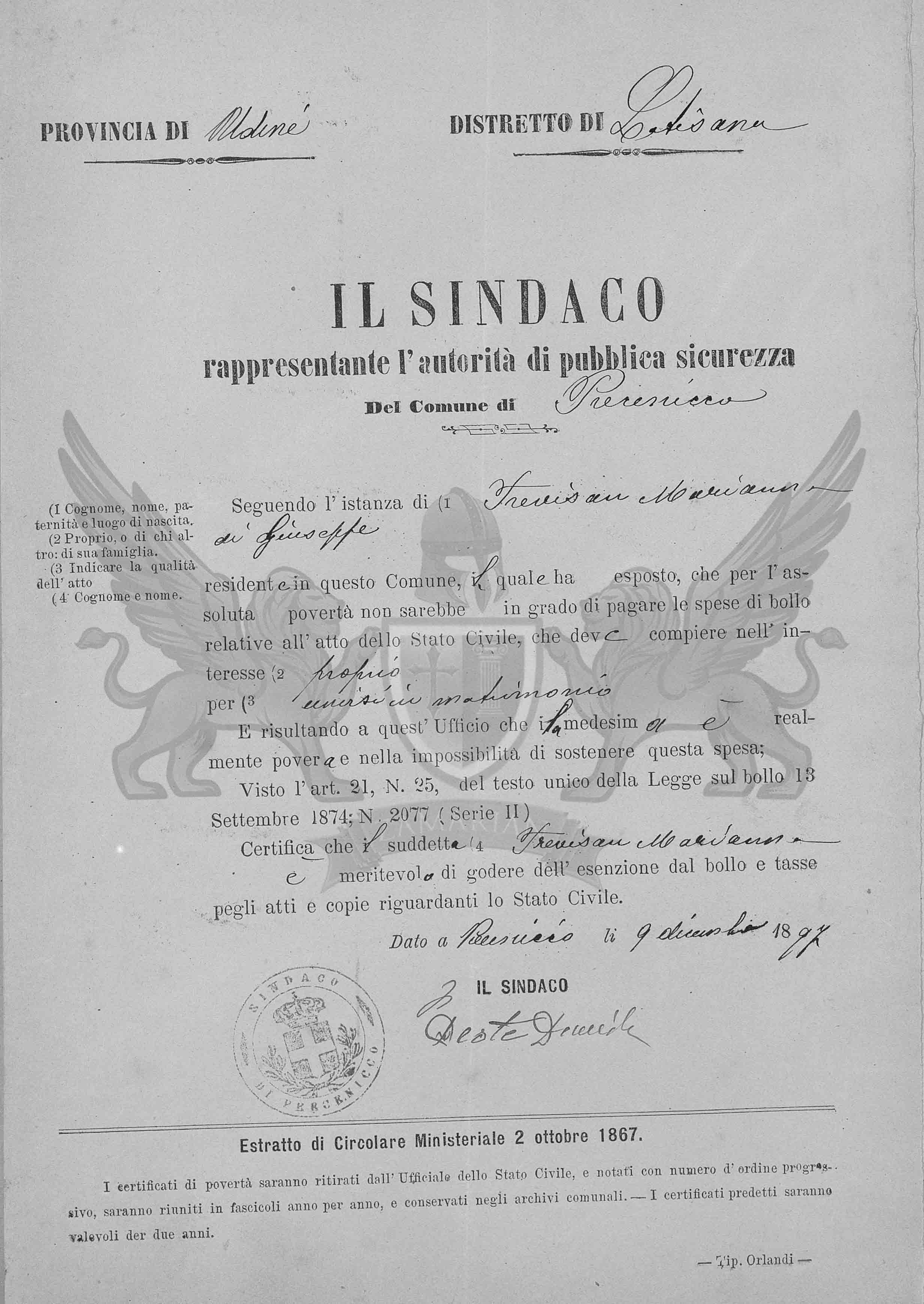 Dado em Dado em Precenicco dia 9 de dezembro de 1897