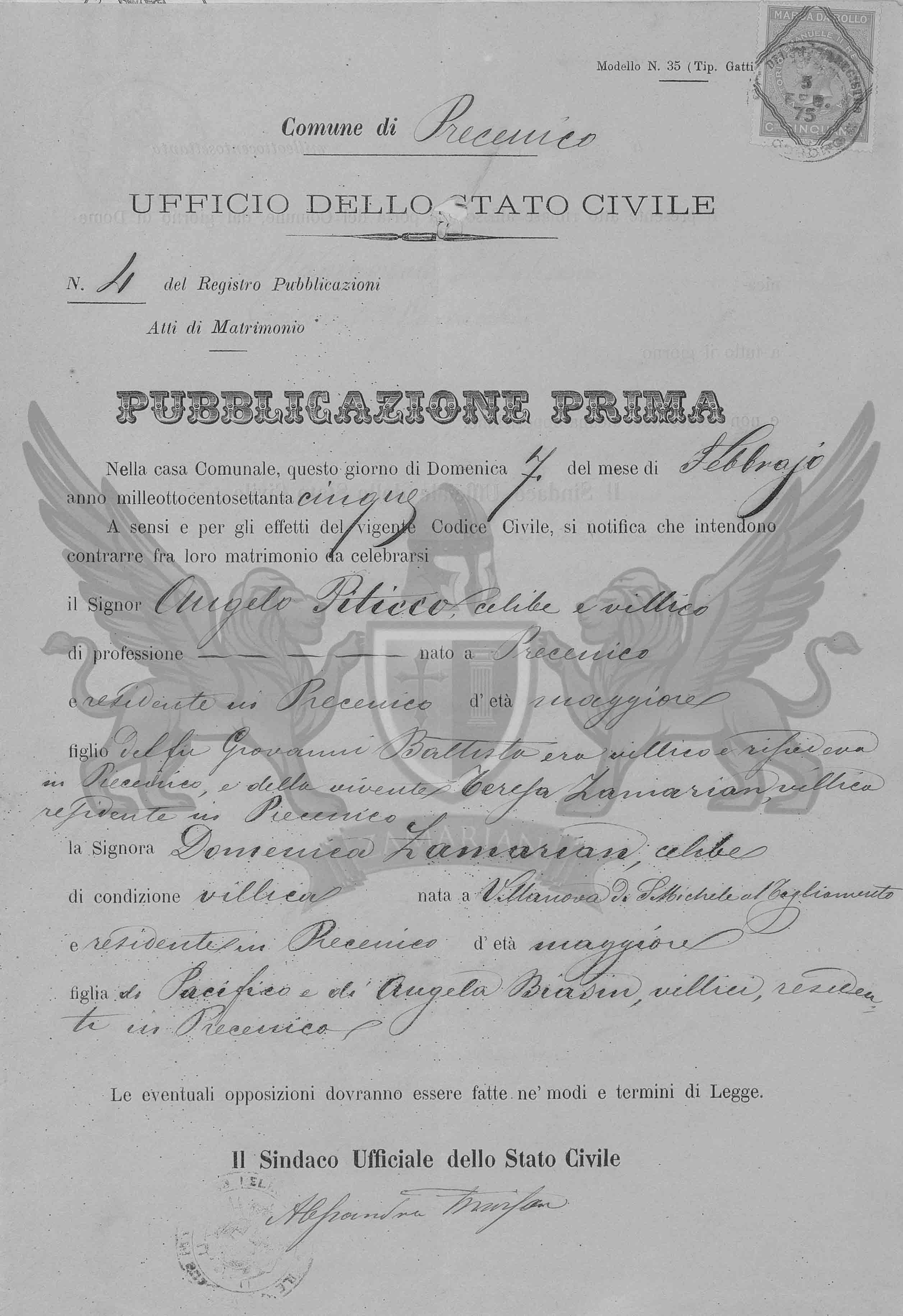 A sensos e pelos efeitos do vigente Código Civil, se notifica que intendem contrair matrimônio entre eles a celebrar o Senhor Angelo Piticco, solteiro e camponês, nascido em Precenicco e residente em Precenicco, de idade maior, filho do falecido Giovanni Battista era camponês e residia em Precenicco e da vivente Teresa Zamarian, camponesa residente em Precenicco e a Senhora Domenica Zamarian, solteira de condição camponesa, nascida em Villanova de San Michele al Tagliamento e residente em Precenicco, de idade maior, filha de Pacifico e de Angela Biasin, camponeses, residentes em Precenicco.
