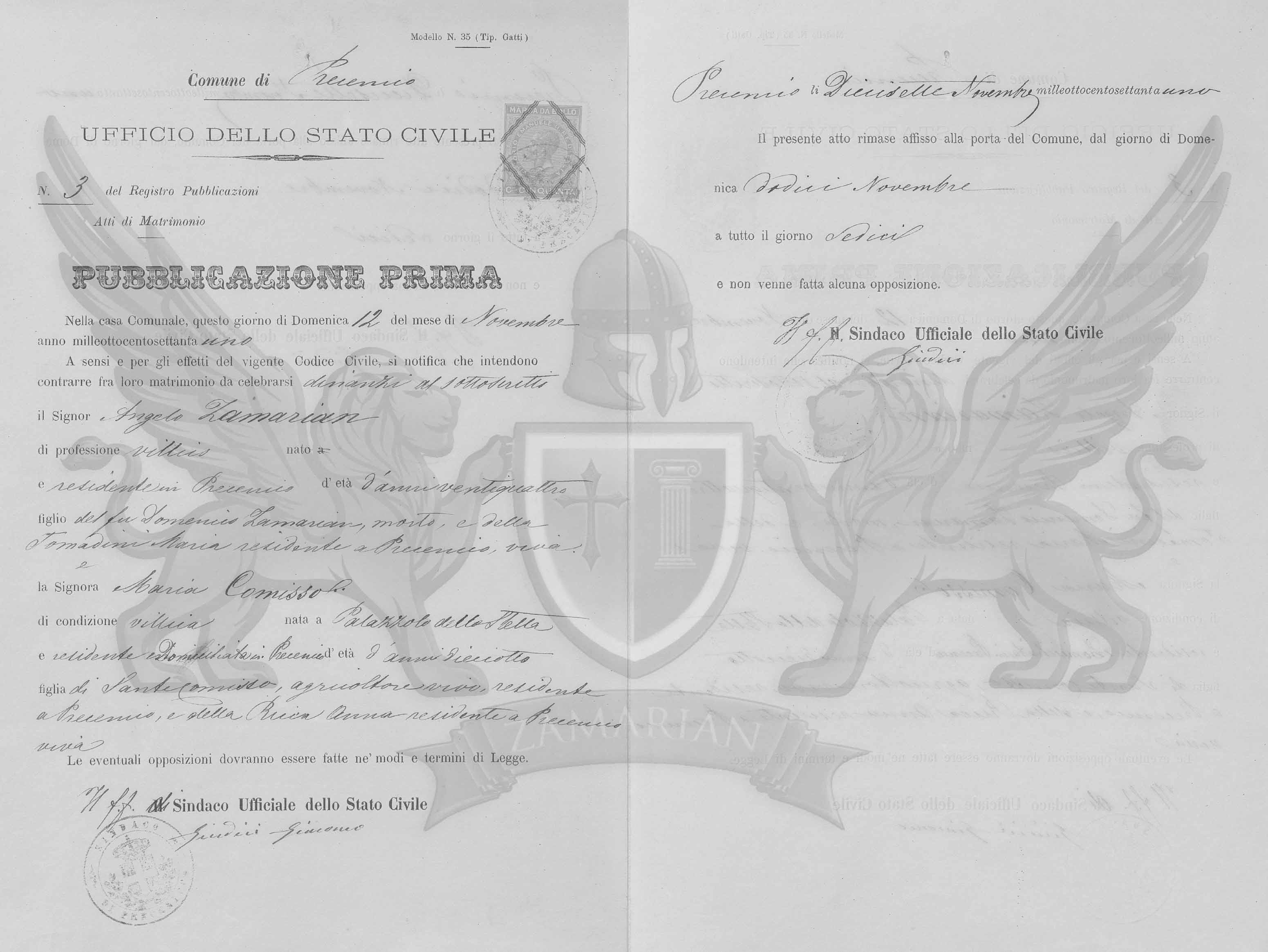 A sensos e pelos efeitos do vigente Código Civil, se notifica que intendem contrair matrimônio entre eles a celebrar diante do subscrito o Senhor Angelo Zamarian de profissão camponês nascido e residente em Precenicco, de idade vinte e quatro anos, filho do finado Domenico Zamarian, falecido, e de Tomadini Maria residente em Precenicco, viva e a Senhora Maria Comisso de condição camponesa, nascida em Palazzolo dello Stella, residente e domiciliada em Precenicco, de idade dezoito anos, filha de Sante Comisso, agricultor, vivo, residente em Precenicco, e de Ricca Anna residente em Precenicco, viva.