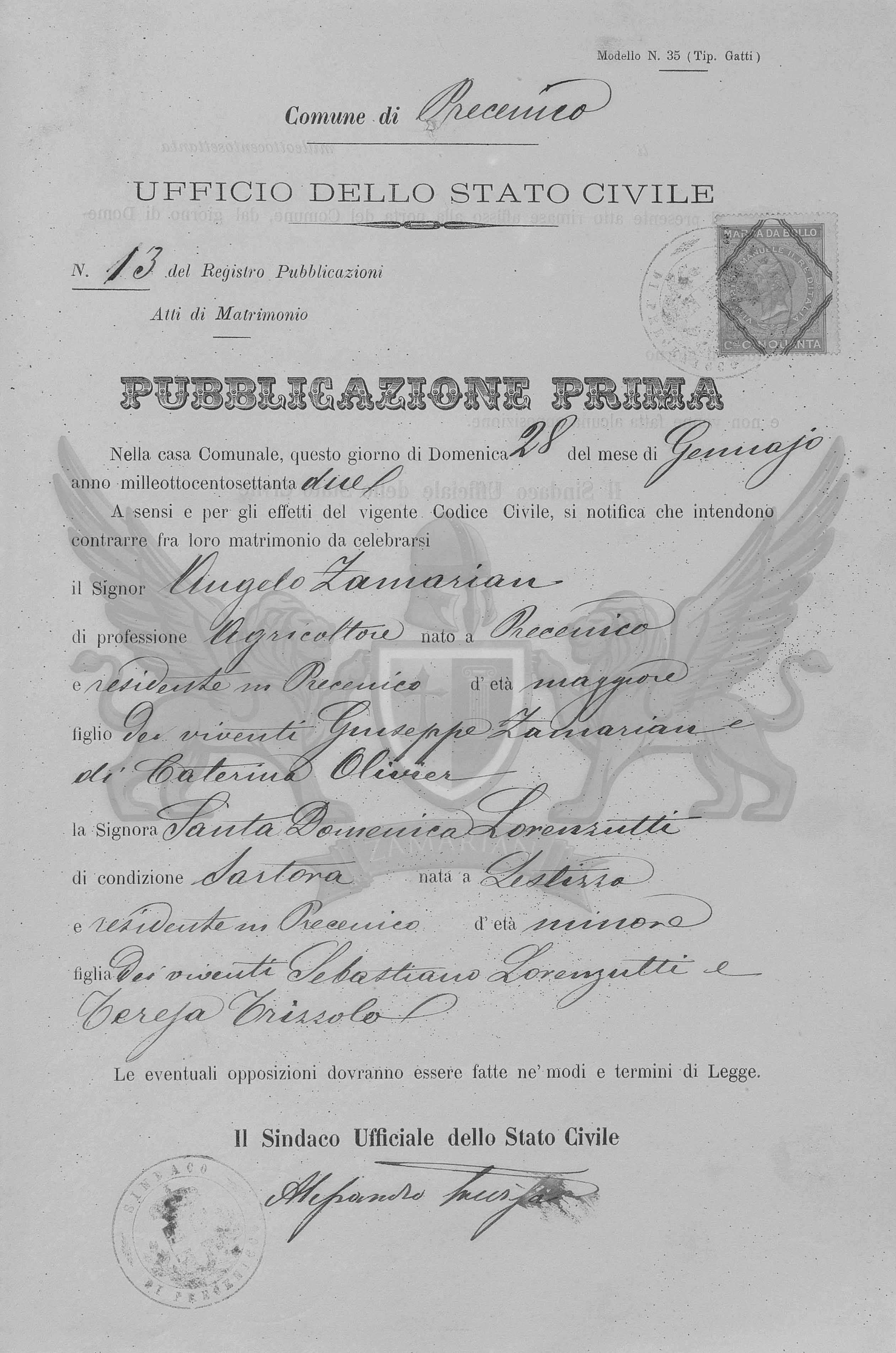 A sensos e pelos efeitos do vigente Código Civil, se notifica que ontem contrair matrimônio entre eles a celebrar neste Ofício o Senhor Angelo Zamarian de profissão Agricultor nascido em Precenicco, e residente em Precenicco, de idade maior, filho dos viventes Giuseppe Zamarian e Caterina Olivier e a Senhora Santa Domenica Lorenzutti de condição artesã, nascida em Lestizza, residente em Precenicco, de idade menor, filha dos viventes Sebastiano Lorenzutti e Teresa Trizzolo.