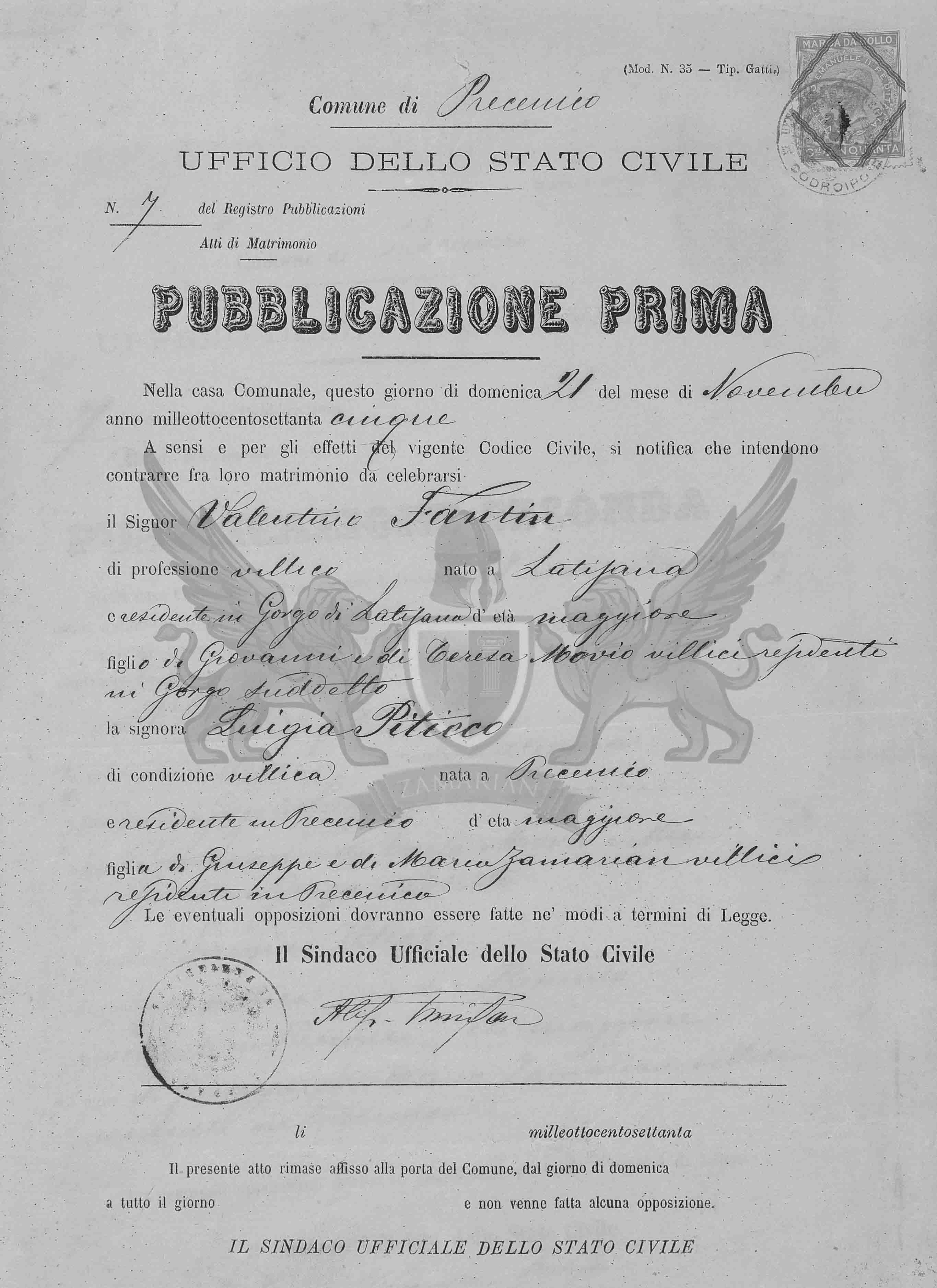 A sensos e pelos efeitos do vigente Código Civil, se notifica que intendem contrair entre eles matrimônio a celebrar-se o Senhor Valentin Fantin, de profissão camponês, nascido em Latisana e residente em Gorgo de Latisana, de idade maior, filho de Giovannni e de Teresa Movio, camponeses residentes em Gorgo supracitado e a Senhora Luigia Piticco, de condição camponesa, nascida em Precenicco e residente em Precenicco, de idade maior, filha de Giuseppe e de Maria Zamarian camponeses residentes em Precenicco.