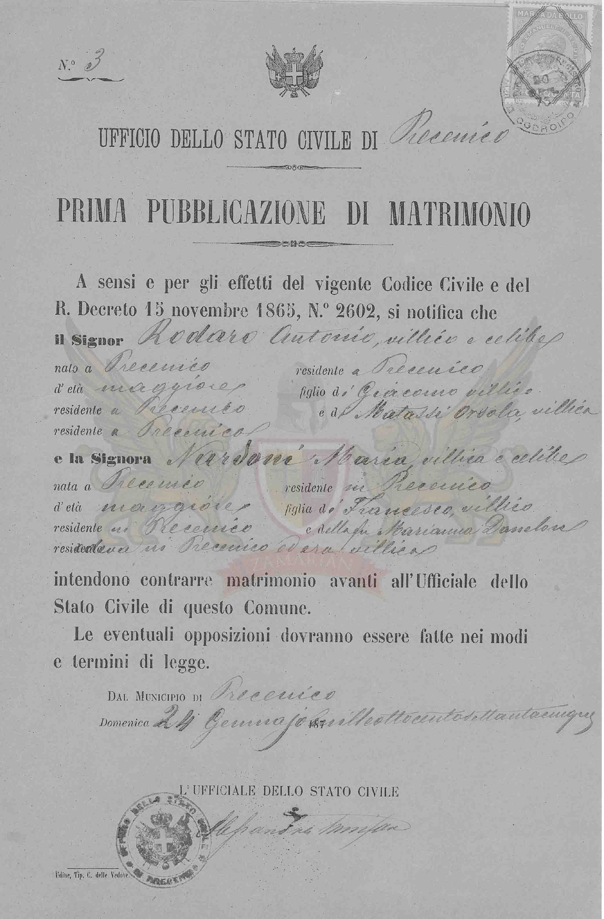 A sensos e pelos efeitos do vigente Código Civil e do Régio Decreto de 15 de novembro de 1865, N.º 2602, se notifica que o Senhor Rodaro Antonio, camponês e solteiro, nascido em Precenicco e residente em Precenicco, de idade maior, filho de Giacomo camponês e residente em Precenicco e Matassi Orsola, camponesa residente em Precenicco e a Senhora Nardoni Maria, camponesa e solteira, nascida em Precenicco e residente em Precenicco, de idade maior, filha de Francesco, camponês residente em Precenicco e da falecida Marianna Danelon residia em Precenicco e era camponesa intendem contrair matrimônio diante do Oficial do Estado Civil deste Município.