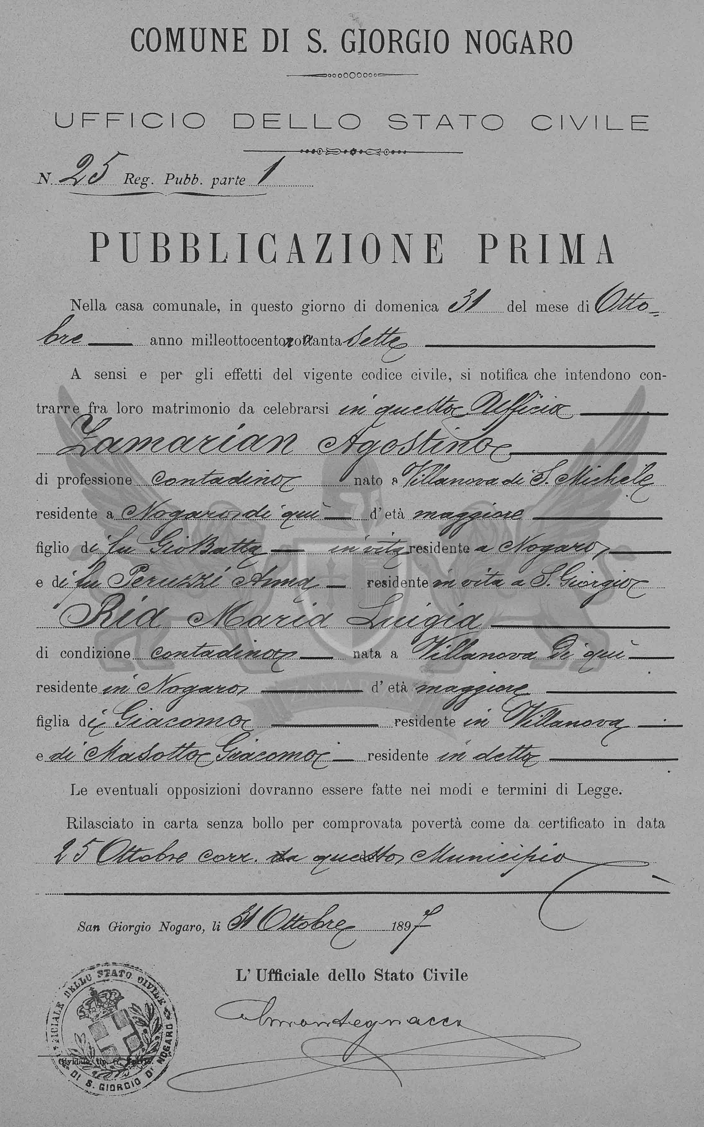 A sensos e pelos efeitos do vigente Código Civil, se notifica que ontem contrair matrimônio entre eles a celebrar neste Ofício Zamarian Agostino de profissão camponês nascido em Villanova de San Michele, residente em Nogaro daqui de idade maior filho do falecido Giovanni Battista residente em vida em San Giorgio e da falecida Peruzzi Anna residente em vida em San Giorgio e Ria Maria Luigia de condição camponesa, nascida em Villanova daqui, residente em Nogaro, de idade maior, filha de Giacomo residente em Villanova e de Masotto Giacoma residente na citada.