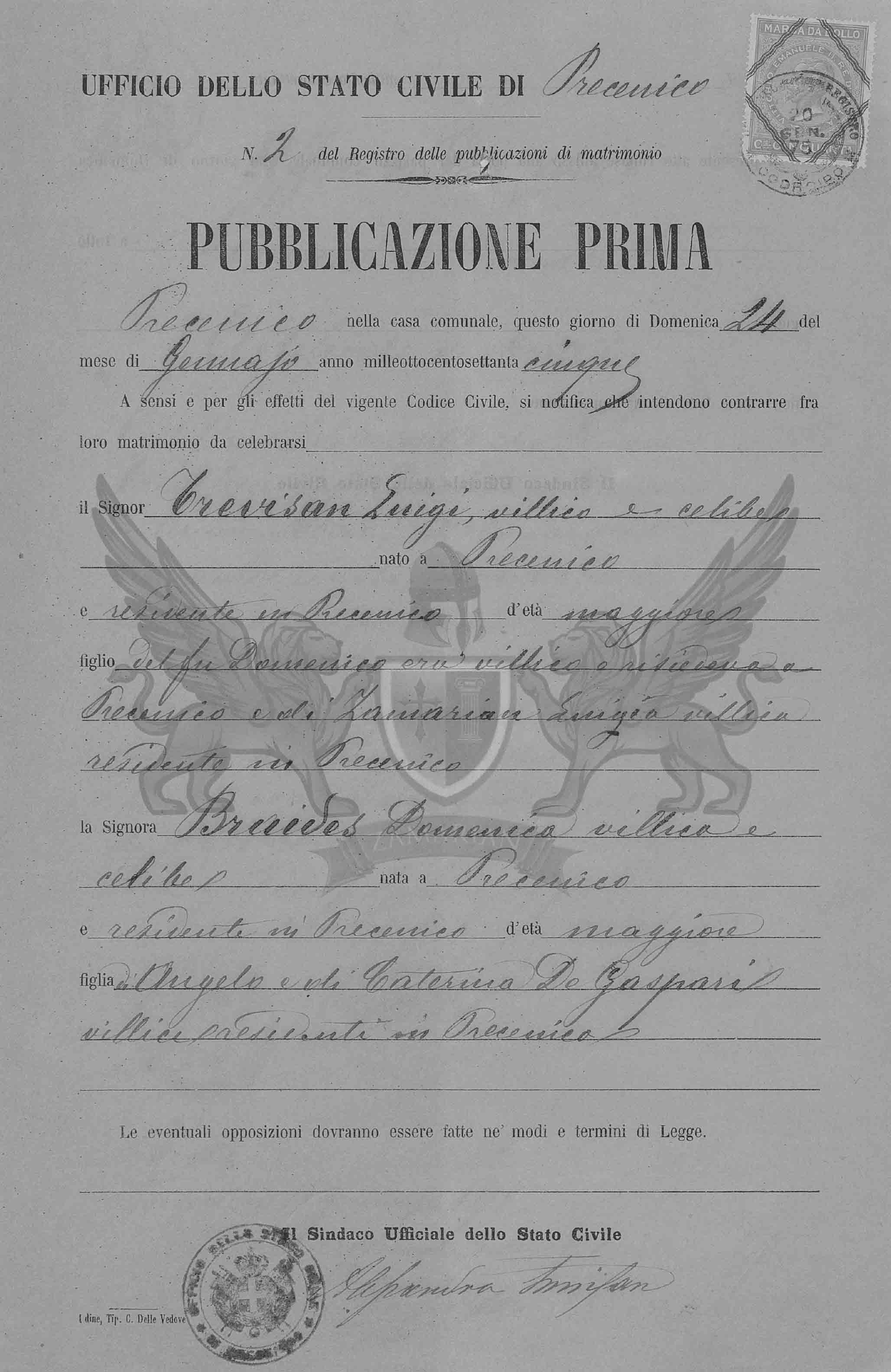 A sensos e pelos efeitos do vigente Código Civil, se notifica que intendem contrair matrimônio entre eles a celebrar o Senhor Trevisan Luigi, camponês e solteiro, nascido em Precenicco e residente em Precenicco, de idade maior, filho do falecido Domenico era camponês e residia em Precenicco e Zamarian Luigia, camponesa residente em Precenicco e a Senhora Braides Domenica, camponesa e solteira, nascida em Precenicco e residente em Precenicco, de idade maior, filha de Angelo e de Caterina De Gaspari camponeses e residentes em Precenicco.