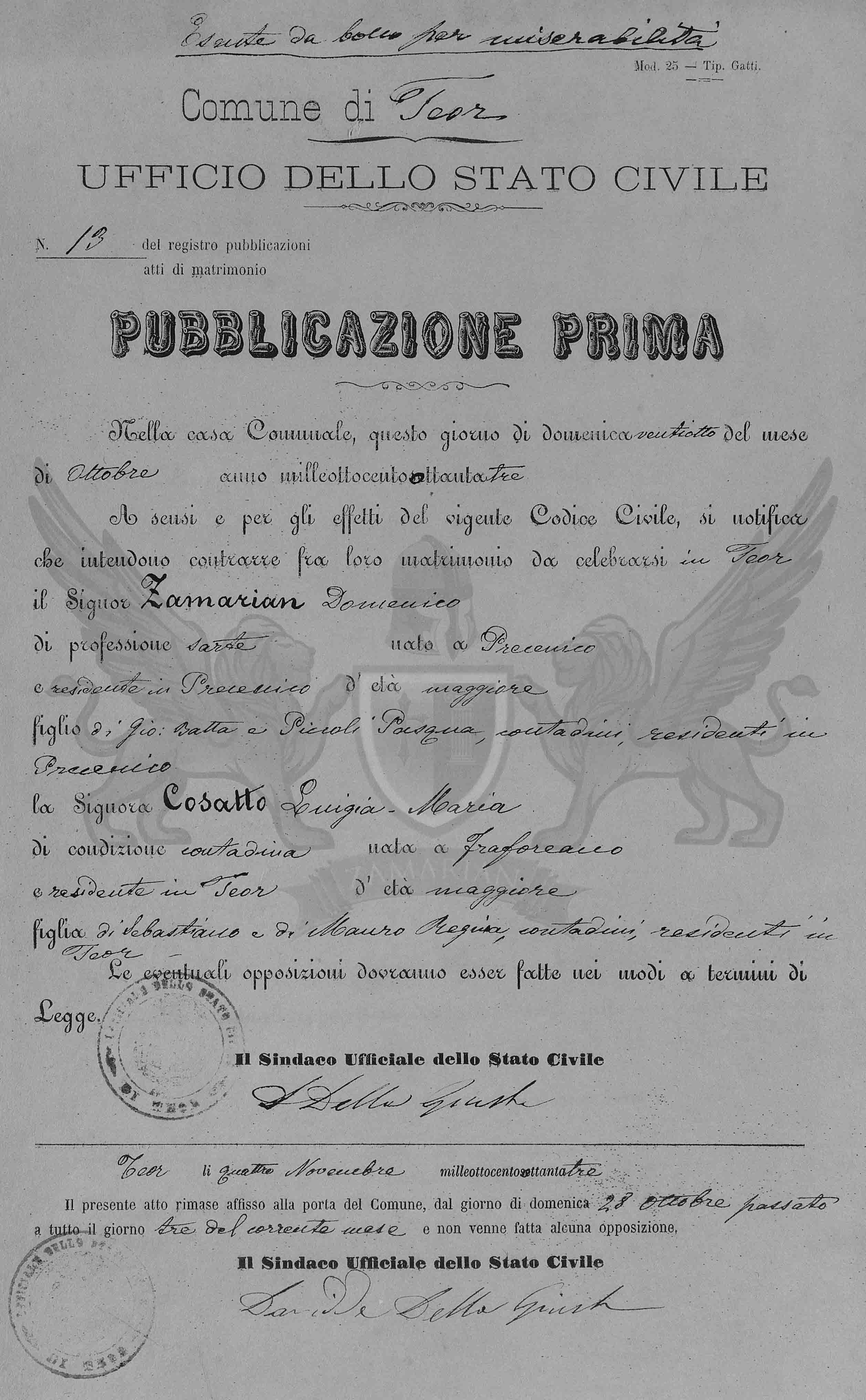 A sensos e pelos efeitos do vigente Código Civil, se notifica que intendem contrair entre eles matrimônio a celebrar-se em Teor o Senhor Zamarian Domenico de profissão sarte nascido em Precenicco de idade maior filho de Giovanni Battista e Piccoli Pasqua, camponeses, residentes em Precenicco e a Senhora Cosatto Luigia Maria de condição camponesa nascida em Fraforeano e residente em Teor de idade maior filha de Sebastiano e de Mauro Regina, camponeses, residentes em Teor.