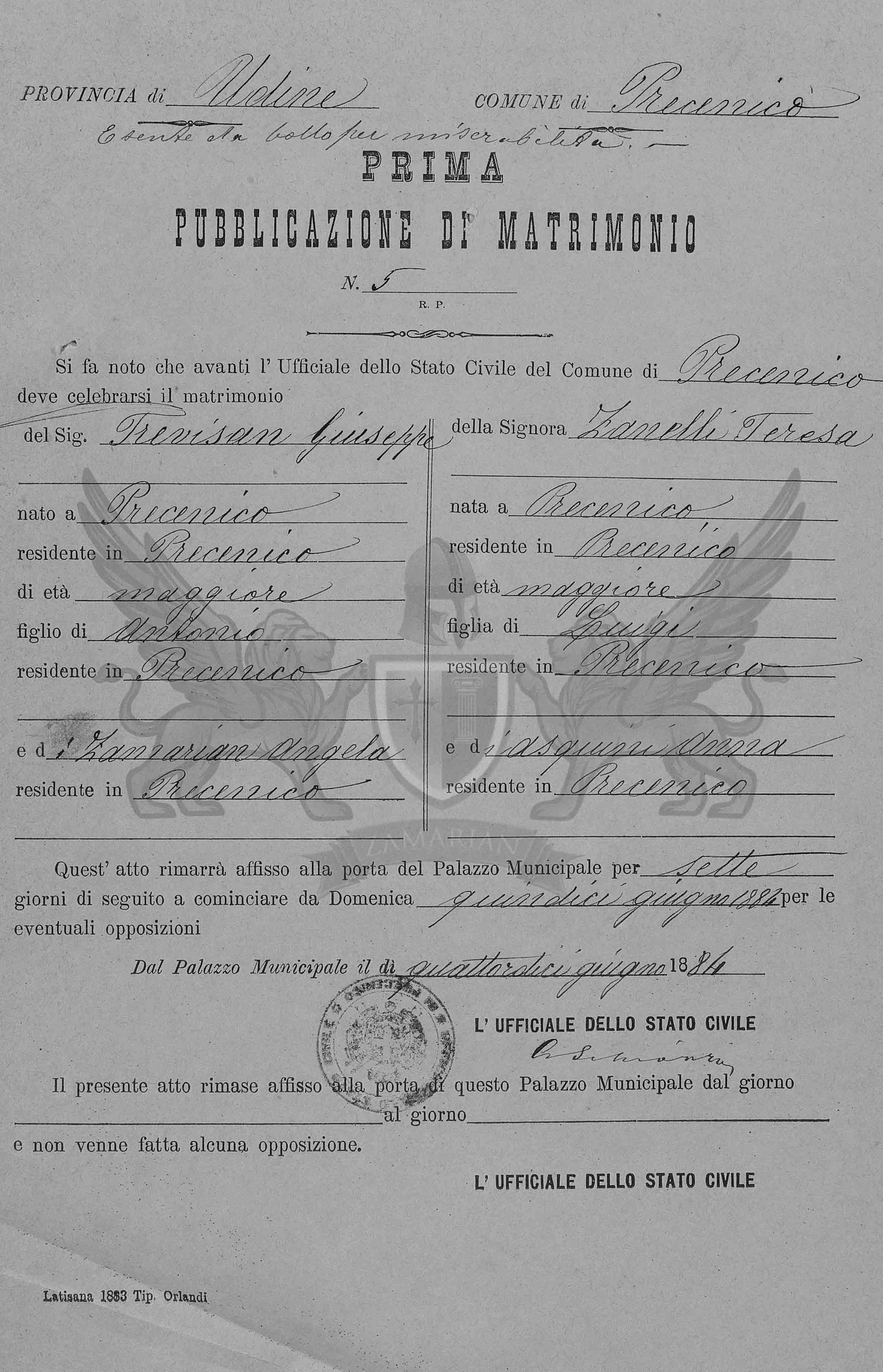 Se faz notório que diante do Oficial do Estado Civil do Município de Precenicco deve celebrar-se o matrimônio do Senhor Trevisan Giuseppe, nascido em Precenicco, de idade maior, residente em Precenicco, filho de Antonio, residente em Precenicco, e de Zamarian Angela, residente em Precenicco, e da Senhora Zanelli Teresa, nascida em Precenicco, residente em Precenicco, de idade maior, filha de Luigia, residente em Precenicco e de Asquini Anna residente Precenicco.