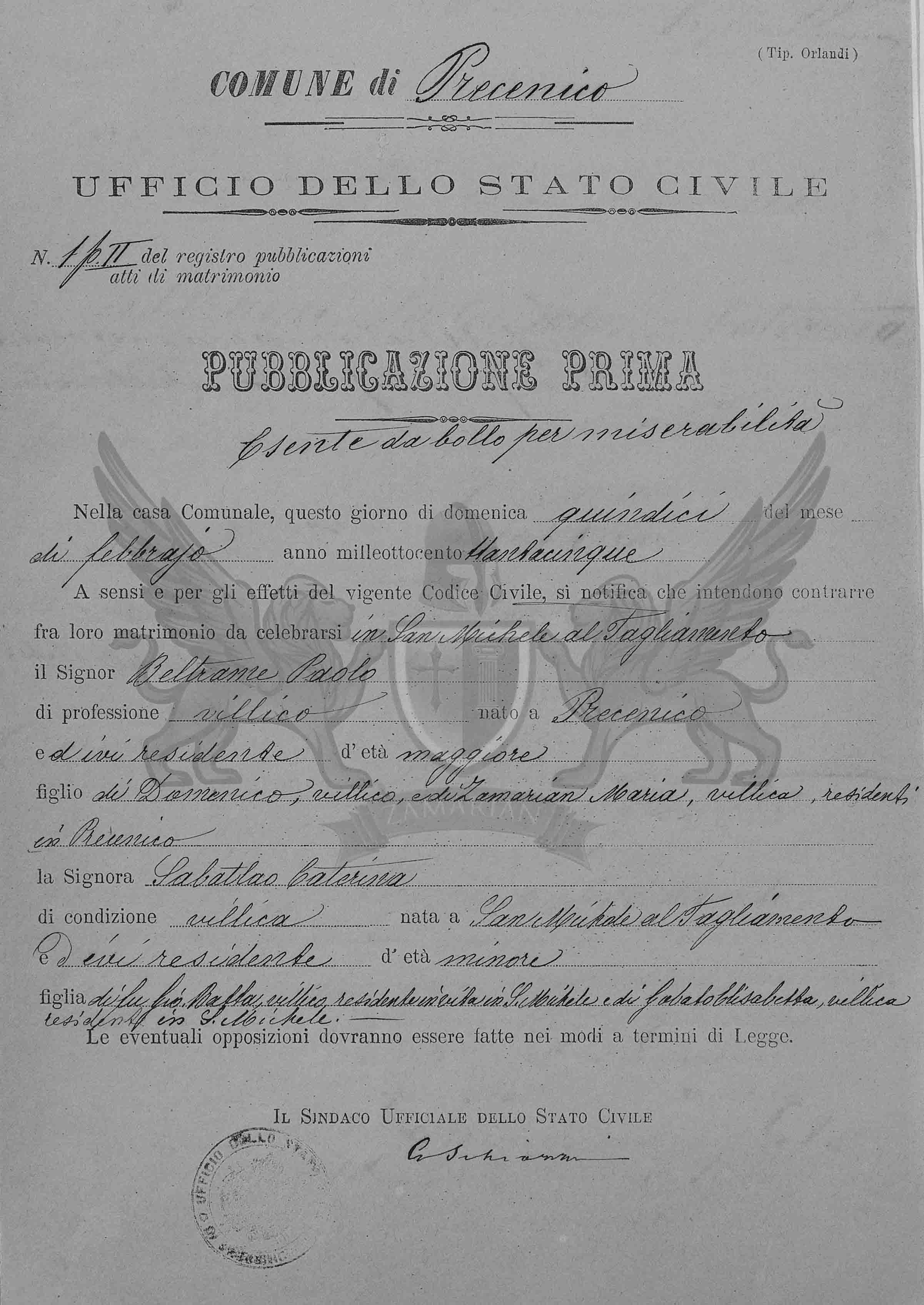 A sensos e pelos efeitos do vigente Código Civil, notifica-se que intentem contrair entre eles matrimônio a celebrar-se em San Michele al Tagliamento o Senhor Beltrame Paolo de profissão camponês, nascido em Precenicco e onde é residente, de idade maior, filho de Domenico, camponês, e de Zamarian Maria, camponesa, residente em Precenicco e a senhora Sabatlao Caterina de condição camponesa, nascida em San Michele al Tagliamento e onde é residente, de idade menor, filha do falecido Giovanni Battista, camponês, residente em vida em San Michele e de Gobato Elisabatta, camponesa, residente em San Michele.