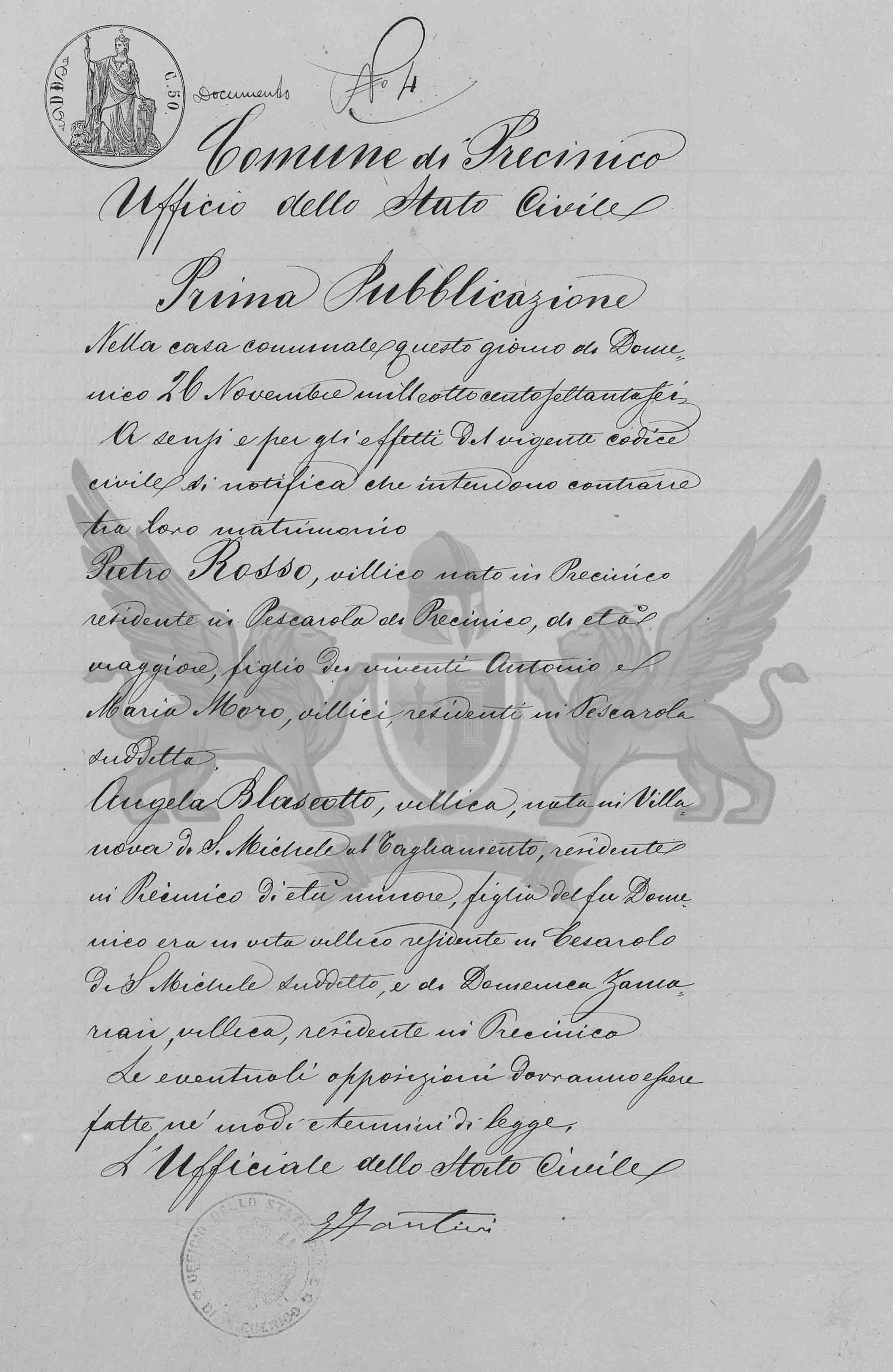 A sensos e pelos efeitos do vigente Código Civil se notifica que intendem contrair matrimônio Pietro Rosso, camponês nascido em Precenicco residente em Pescarola de Precenicco, de idade maior, filho dos viventes Antonio e Maria Moro, camponeses, residentes em Pescarola supracitada.
