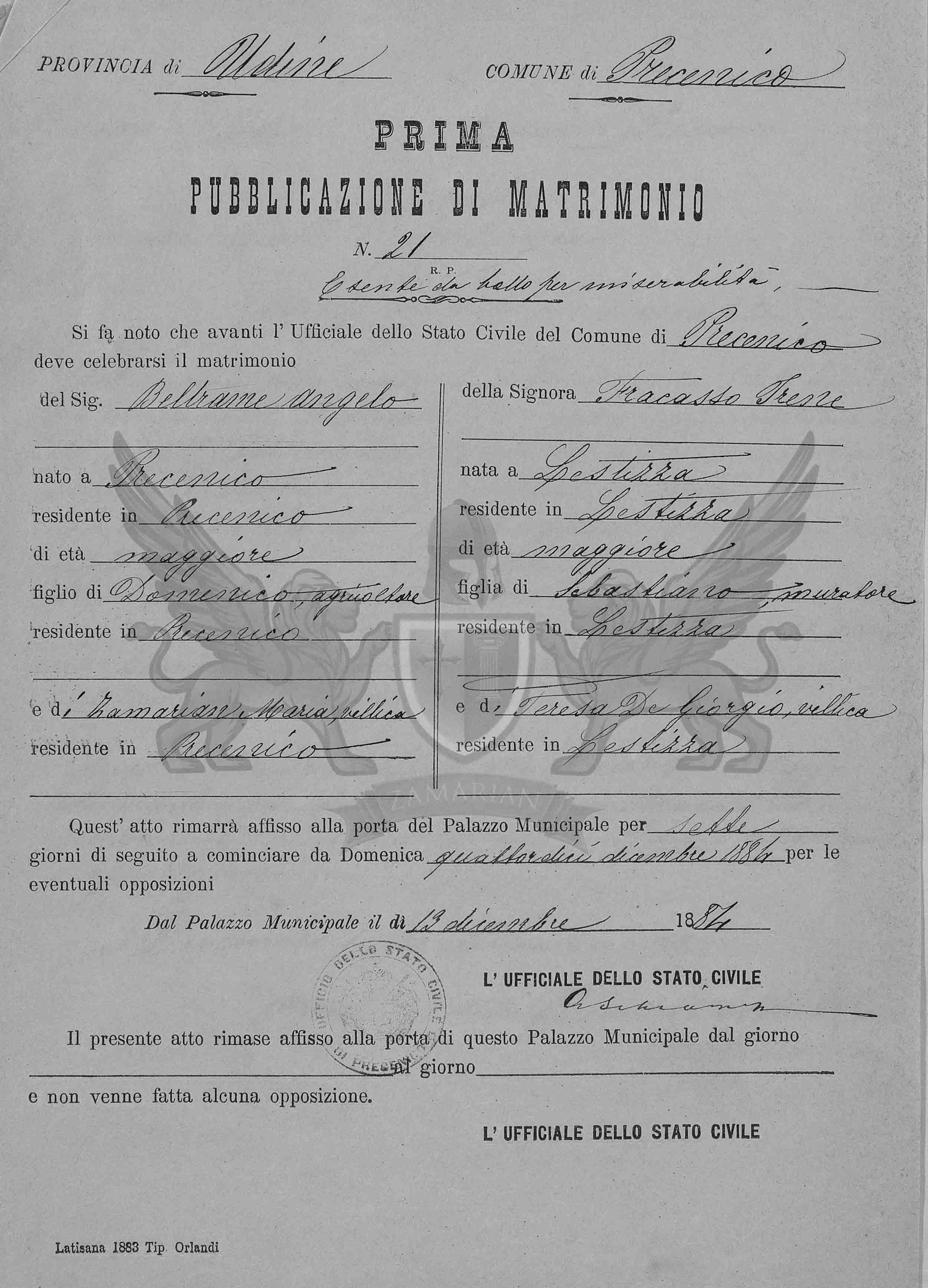 Se faz notório que diante do Oficial do Estado Civil do Município de Precenicco deve celebrar-se o matrimônio do Senhor Beltrame Angelo nascido em Precenicco, residente em Precenicco, de idade maior, filho de Domenico, agricultor, residente em Precenicco e de Zamarian Maria, camponesa, residente em Precenicco e da Senhora Fracasso Irene, nascida em Lestizza, residente em Lestizza, de idade maior, filha de Sebastiano, construtor e de Teresa De Giorgio, camponesa, residente em Lestizza.