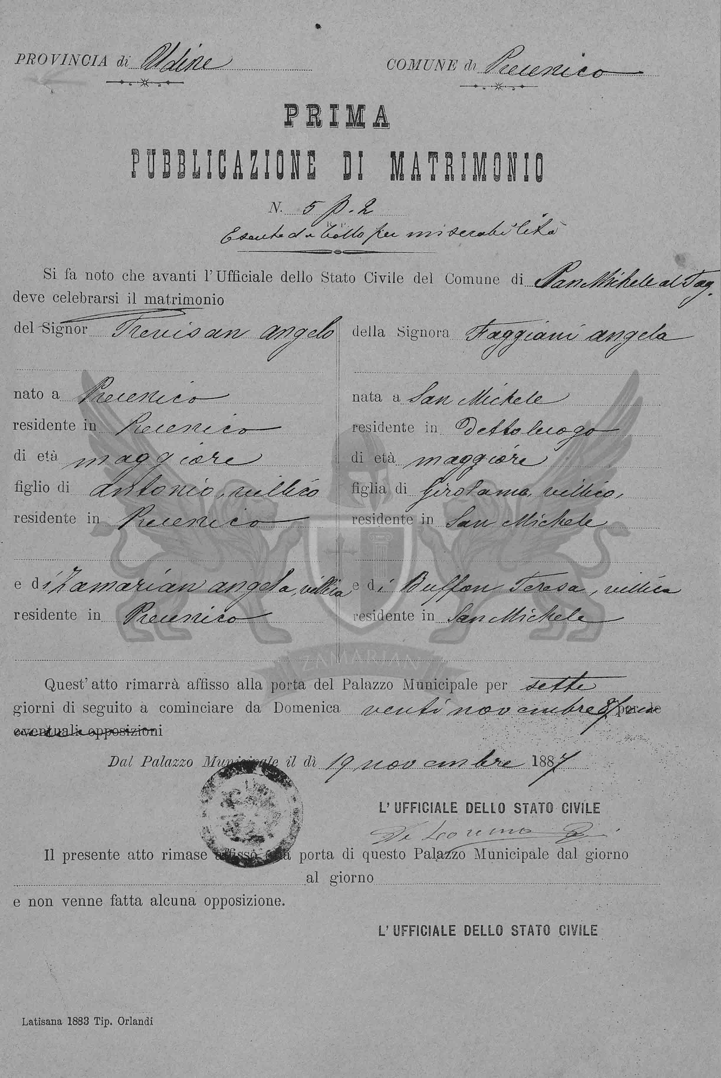 Se faz notório que diante do Oficial do Estado Civil do Município de Precenicco deve celebrar-se o matrimônio do Senhor Trevisan Angelo nascido em Precenicco, residente em Precenicco, de idade maior, filho de Antonio, camponês, residente em Precenicco e de Zamarian Angela, camponesa, residente em Precenicco e da Senhora Faggiani Angela, nascida em San Michele, residente em dito local, de idade maior, filha de Girolamo, camponês, residente em San Michele e de Buffon Teresa, camponesa, residente em San Michele.