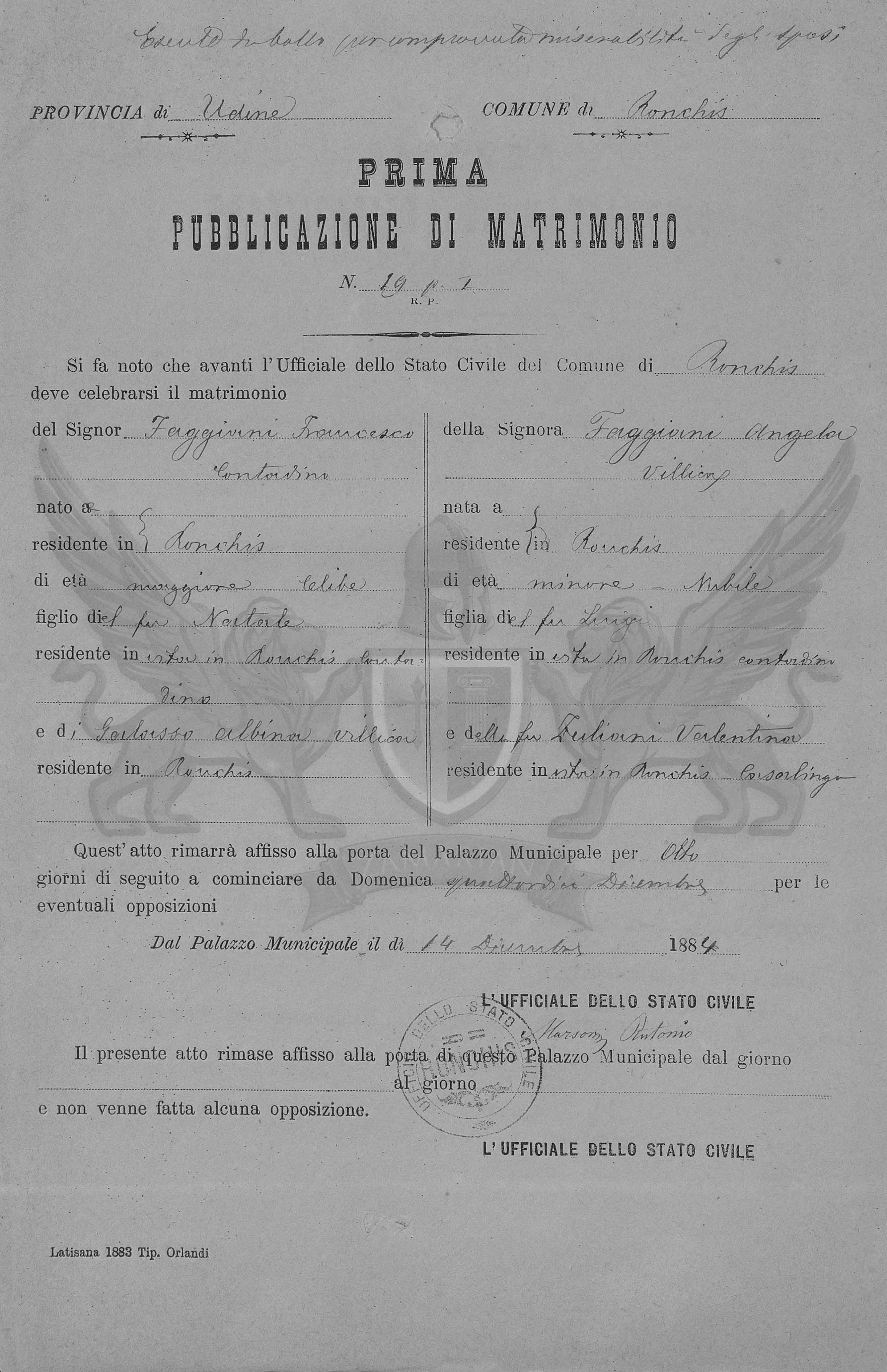 Se faz notório que diante do Oficial do Estado Civil do Município de Ronchis deve celebrar-se o matrimônio do Senhor Faggiani Francesco, camponês, filho do finado Natale, residente em vida em Ronchis, camponês, e de Galasso Albina, camponesa, residente em Ronchis, e da Senhora Faggiani Angela, Camponesa, nascida em Ronchis, residente em Ronchis, camponesa, e da finada Zuliani Valentina residente em vida em Ronchis, dona de casa.