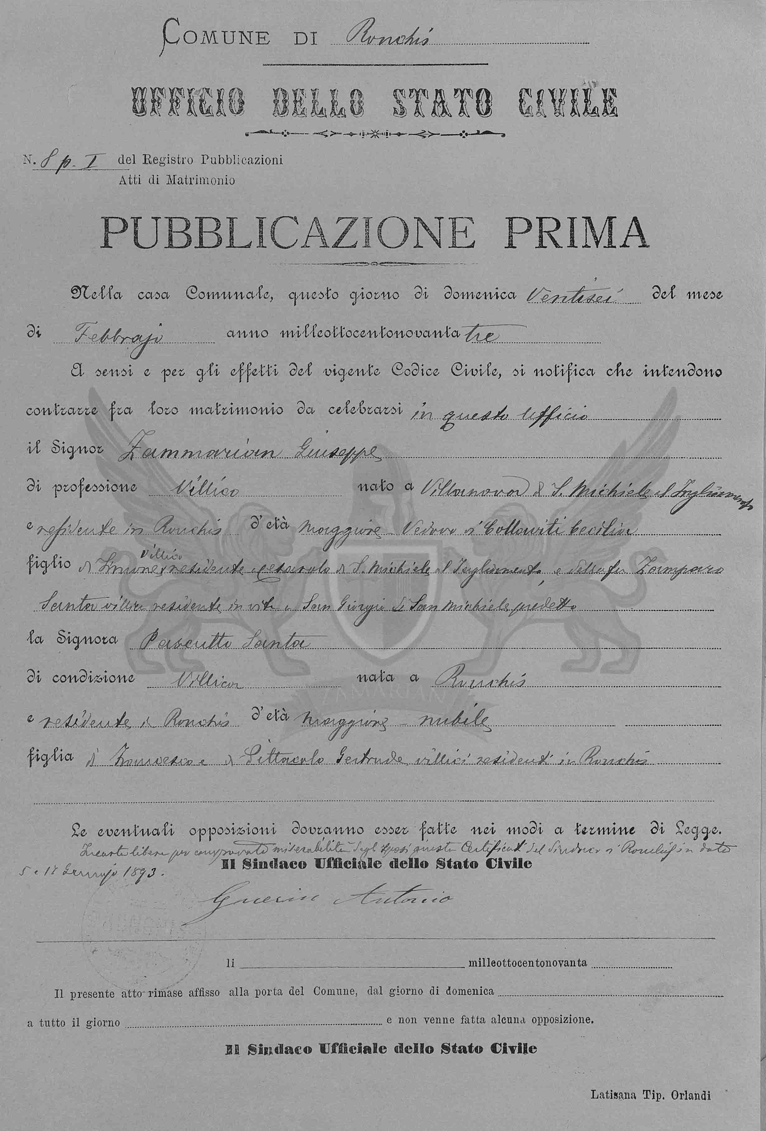 A sensos e para os efeitos do vigente Código Civil, se notifica que intendem contrair entre eles matrimônio a celebrar-se neste ofício, o Senhor Zammarian Giuseppe, de profissão camponês, nascido em Villanova de San Michele al Tagliamento e residente em Ronchis, de idade maior, viúvo de Collavitti Cecilia filho de Simone, camponês, residente em Cesarolo de San Michele al Tagliamento e da falecida Zamparo Santa, camponesa, residente em vida em San Gorgio de San Michele pré citado, e a Senhora Pascutto Santa, de condição camponesa, nascida em Ronchis e residente em Ronchis, de maior, filha de Francesco e de Pittacolo Gertrude, camponeses, residentes em Ronchis.