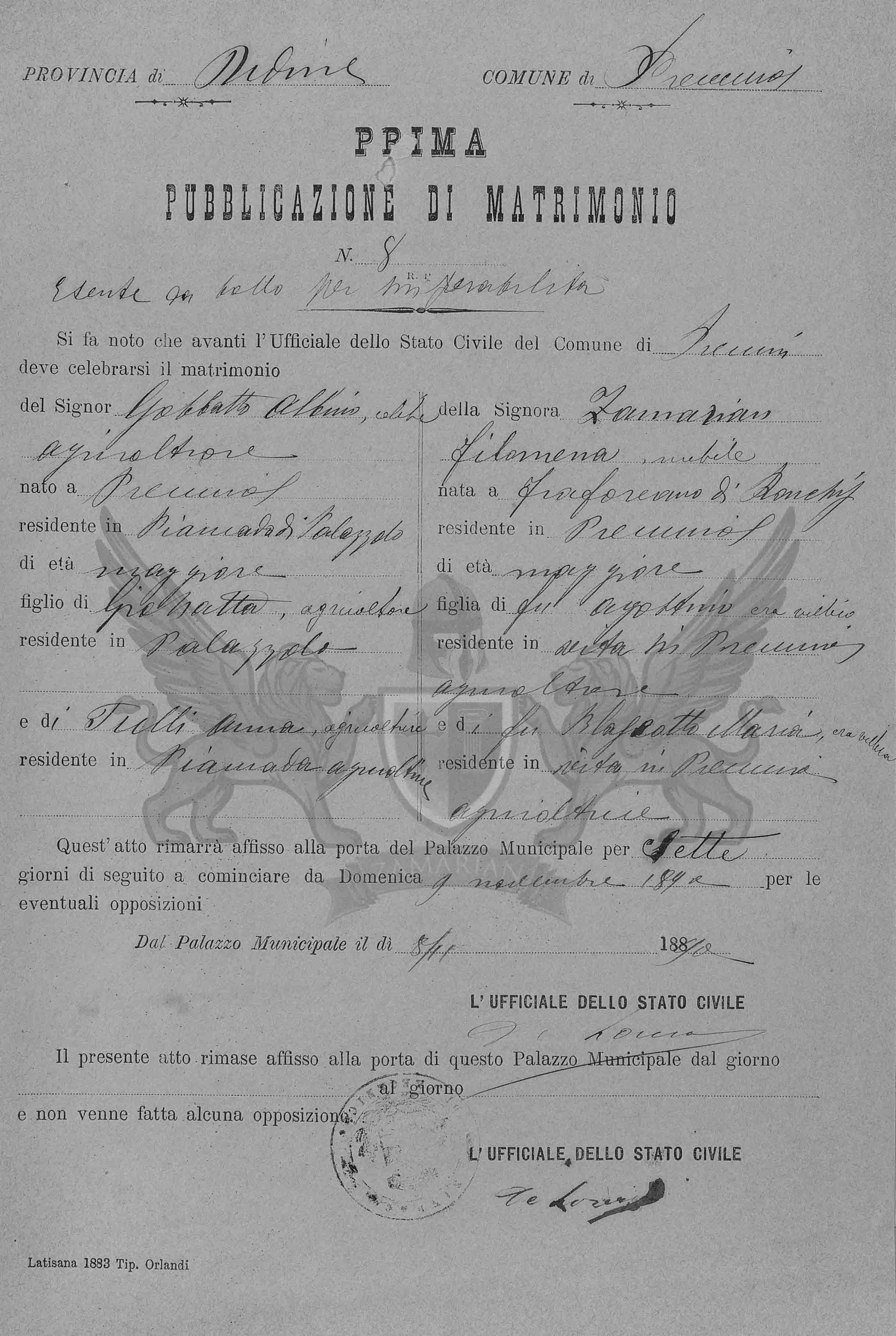 Se faz notório que diante do Oficial do Estado Civil do Município de Precenicco deve celebrar-se o matrimônio do Senhor Gobbatto Albino, solteiro, nascido em Precenicco, residente em Piancada de Palazzolo, de idade maior, filho de Giovanni Battista, agricultor, residente em Palazzolo e de Tulli Anna, agricultora, residente em Precenicco, agricultor e da Senhora Zamarian Filomena, solteira, nascida em Fraforeano de Ronchis, residente em Precenicco, de idade maior, filha do falecido Agostino, era camponês, residente em vida em Precenicco e da falecida Blaseotto Maria, era camponesa, residente em vida em Precenicco, agricultora.