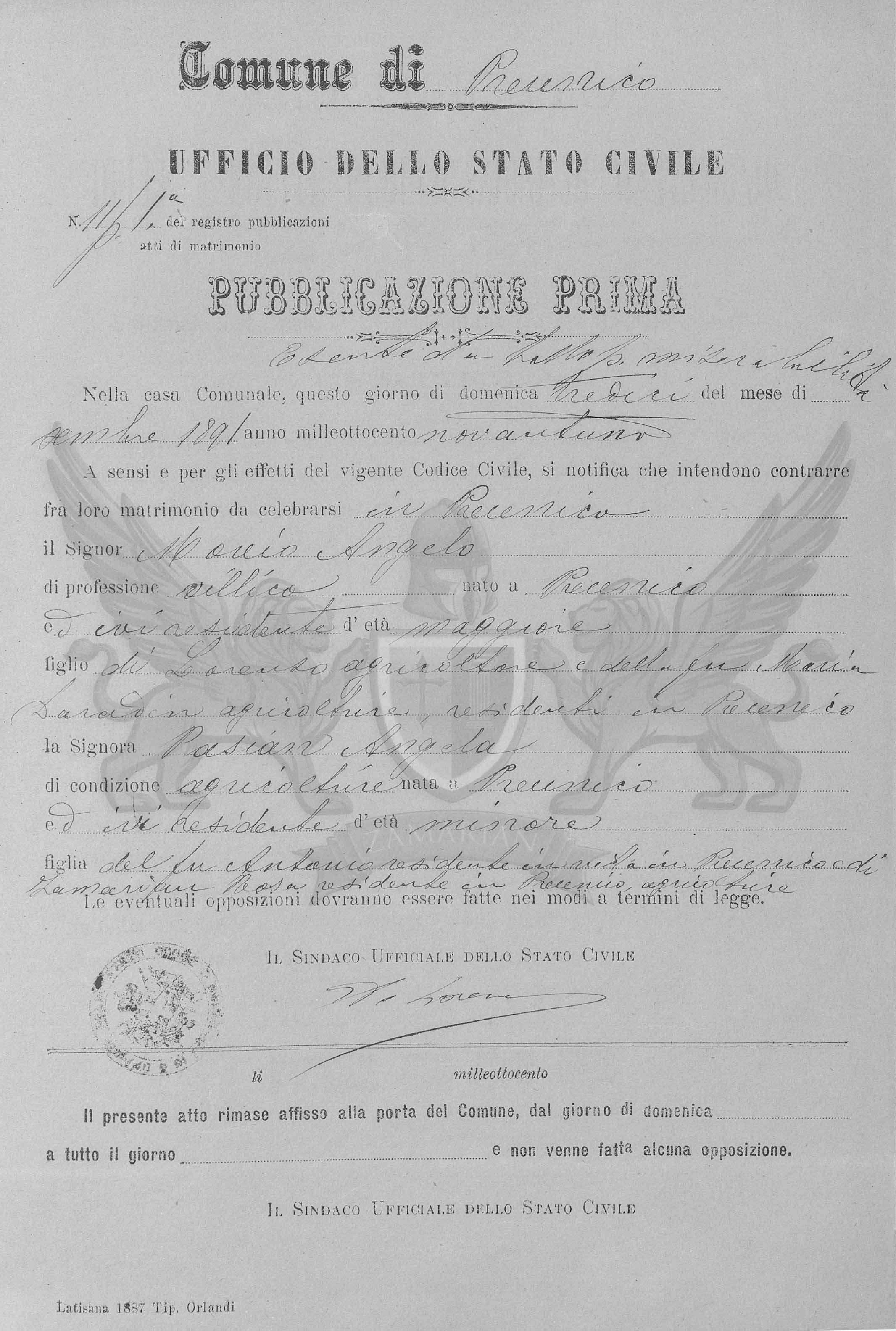 A sensos e pelos efeitos do vigente Código Civil, se notifica que ontem contrair matrimônio entre eles a celebrar neste Ofício o Senhor Movio Angelo de profissão camponês nascido em Precenicco,e onde é residente, de idade maior, filho de Lorenzo e da finada Maria Daradin, agricultores, residentes em Precenicco e a Senhora Pasian Angela de condição agricultora, nascida em Precenicco, onde é residente, de idade menor, filha do finado Antonioresidente em vida em Precenicco e de Zamarian Rosa, residente em Precenicco, agricultora.