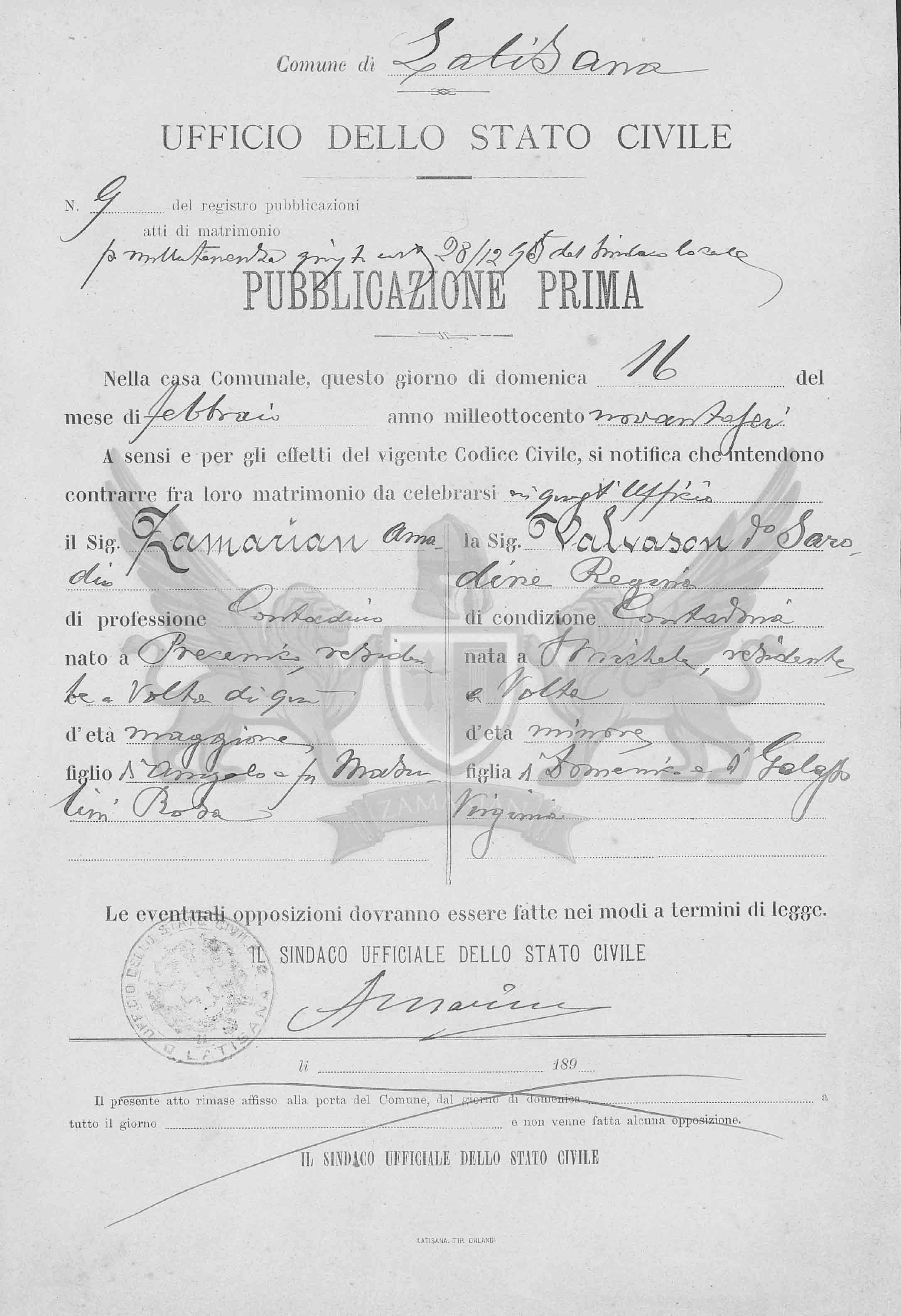A sensos e pelos efeitos do vigente Código Civil, se notifica que ontem contrair matrimônio entre eles a celebrar neste Ofício o Senhor Zamarian Amadio de profissão camponês nascido em Precenicco, residente em Volta daqui de idade maior filho de Angelo e da finada Masolini Rosa e a Senhora Valvason dito Sarodine Regina de condição Camponesa, nascida em San Michele al Tagliamento, residente em Volta, de idade menor, filha de Domenico e de Galasso Virginia.