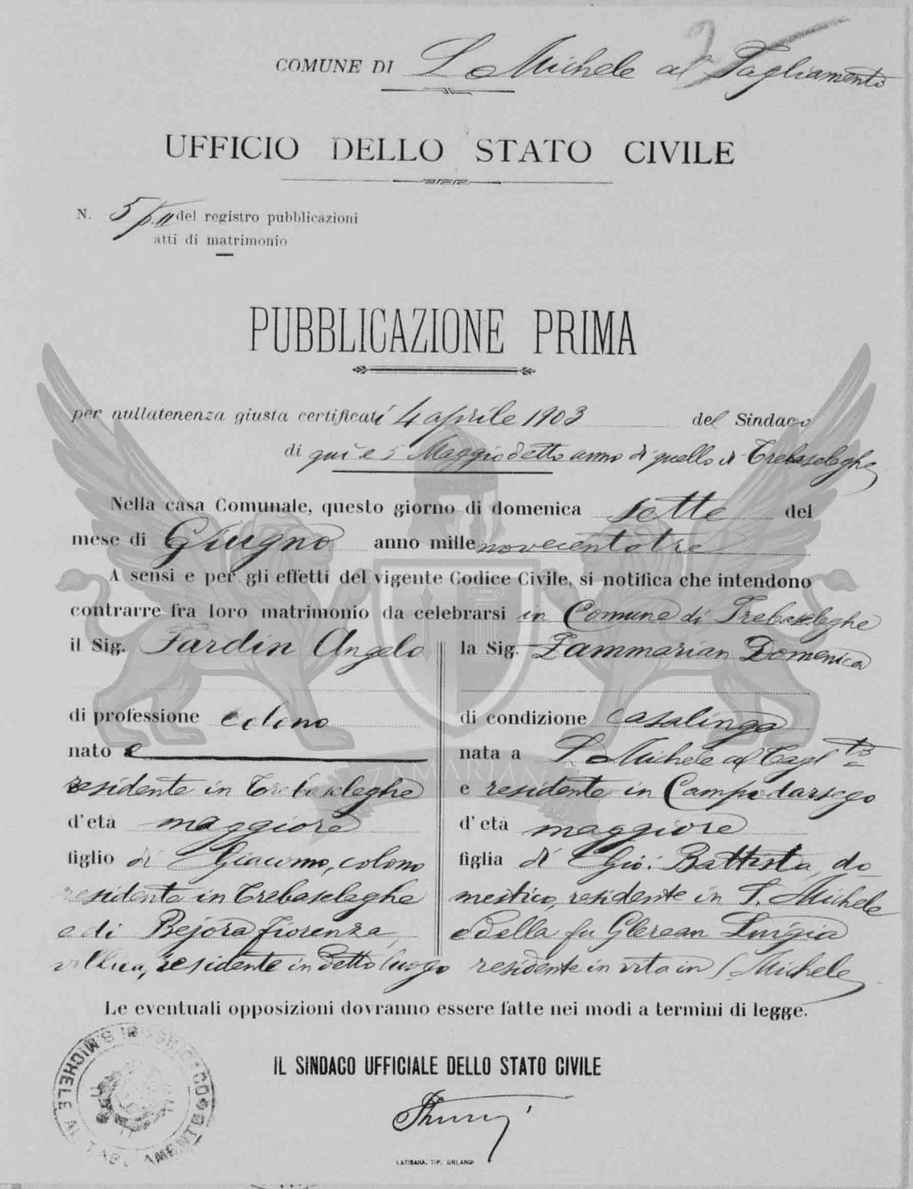 A sensos e pelos efeitos do vigente Código Civil, se notifica que intendem contrair matrimônio entre eles a celebrar neste no município de Trebaseleghe o Senhor Fardin Angelo de profissão colono nascido e residente em Trebaseleghe, de idade maior, filho de Giacomo, colono, residente em Trebaseleghe e de Rejora Fiorenza, camponesa, residente no local referido e a Senhora Zamarian Domenica de condição dona de casa, nascida em San Michele al Tagliamento, residente em Campodarsego, de idade maior, filha de Giovanni Battista, doméstico, residente em San Michele e da falecida Glerean Luigia, residente em vida em San Michele.