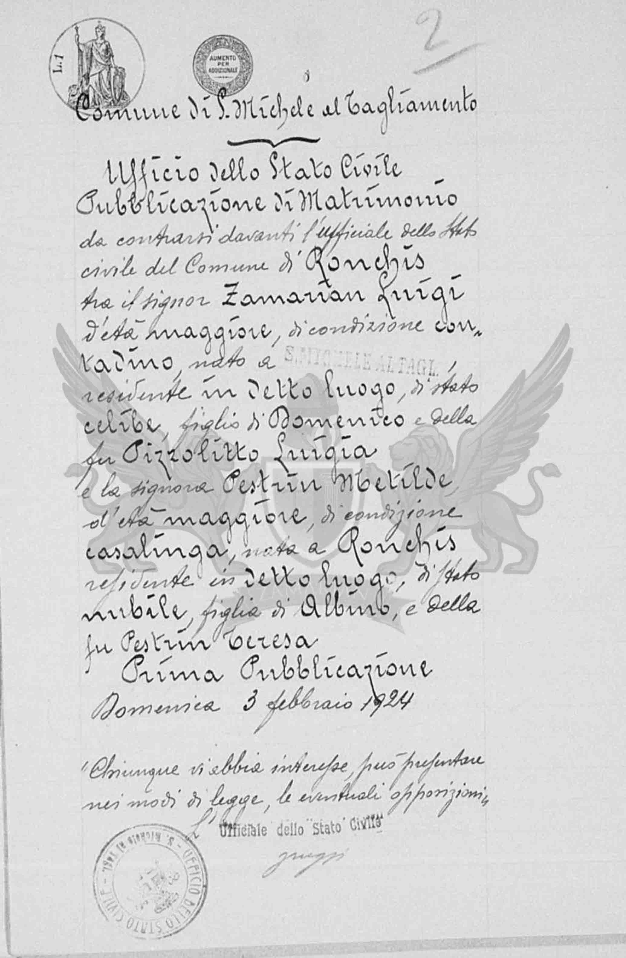 Publicação de Matrimônio à contrair diante o oficial do Estado Civil do Município de Ronchis entre o Senhor Zamarian Luigi de idade maior, de condição camponês, nascido em San Michele al Tagliamento, residente em referido local, de estado solteiro, filho de Domenico e da falecida Pizzolitto Luigia e a Senhora Pestrin Metilde, de idade maior, de condição dona de casa, nascida em Ronchis residente em referido local, de estado solteira, filha de Albino, e da falecida Pestrin Teresa.