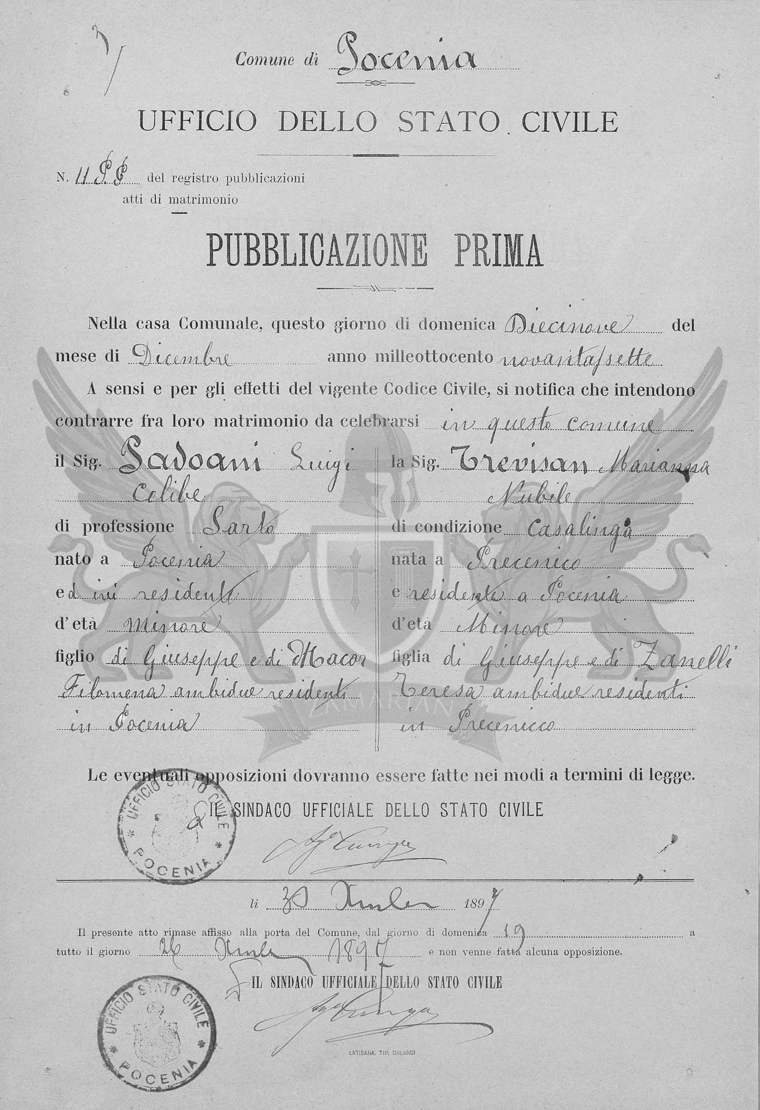 A sensos e pelos efeitos do vigente Código Civil, se notifica que ontem contrair matrimônio entre eles a celebrar neste Ofício o Senhor Padoani Luigi, solteiro de profissão artesão nascido em Pocenia, e onde é residente de idade menor filho de Giuseppe e de Macor Filomena, ambos dois residentes em Pocenia e a Senhora Trevisan Marianna, solteira de condição dona de casa, nascida em Precenicco, residente em Pocenia, de idade menor, filha de Giuseppe e Zanelli Teresa, ambos os dois residentes em Precenicco.