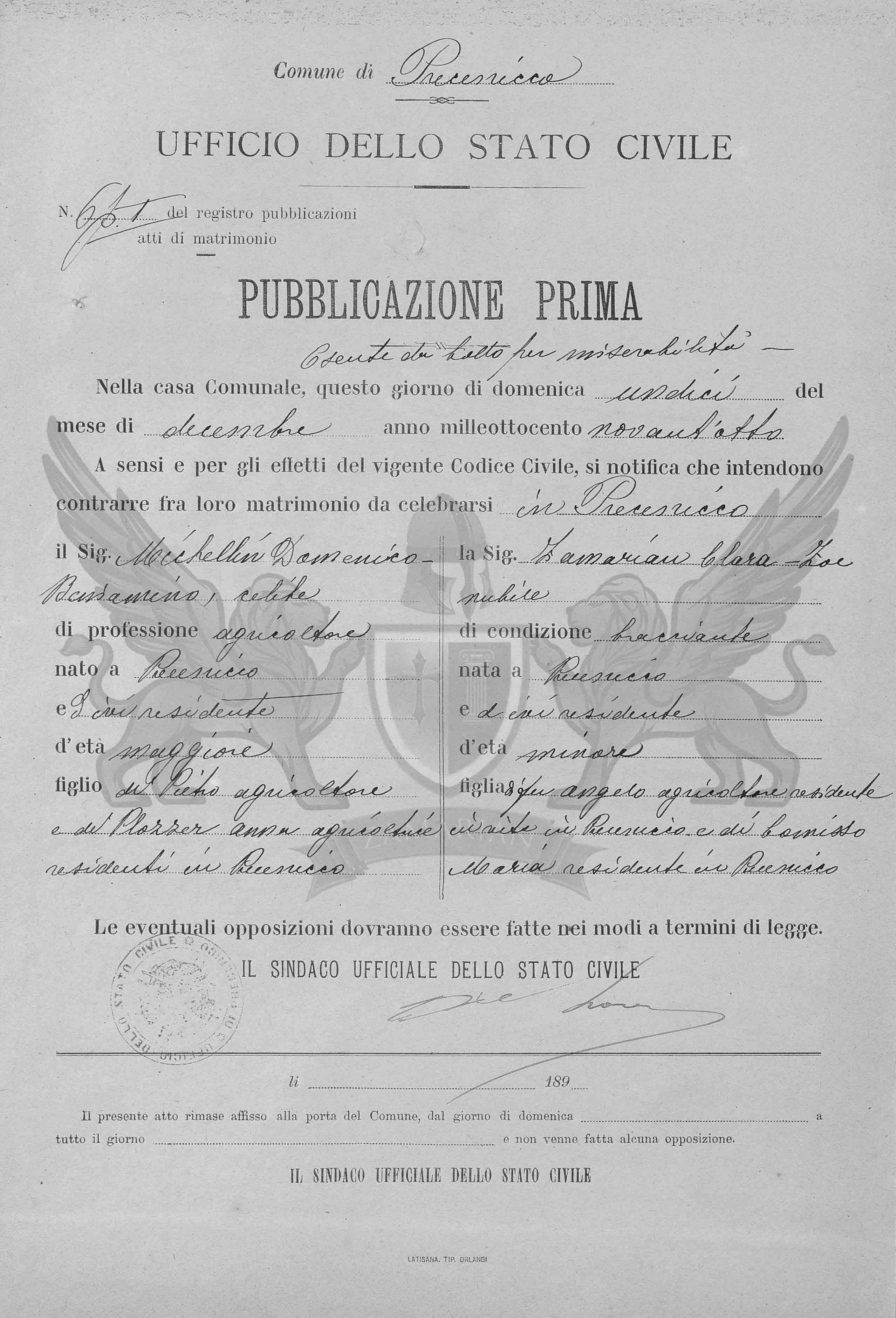 A sensos e pelos efeitos do vigente Código Civil, se notifica que ontem contrair matrimônio entre eles a celebrar em Precenicco o Senhor Michelin Domenico, solteiro de profissão agricultor, nascido em Precenicco, e onde é residente, de idade maior, filho de Pietro, agricultor e de Plozzer Anna, agricultora, residentes em Precenicco e a Senhora Zamarian Clara Zoe, solteira de condição ajudante, nascida em Precenicco, e onde é residente, de idade menor, filha do falecido Angelo, agricultor, residente em vida em Precenicco e de Comisso Maria, residente em Precenicco.