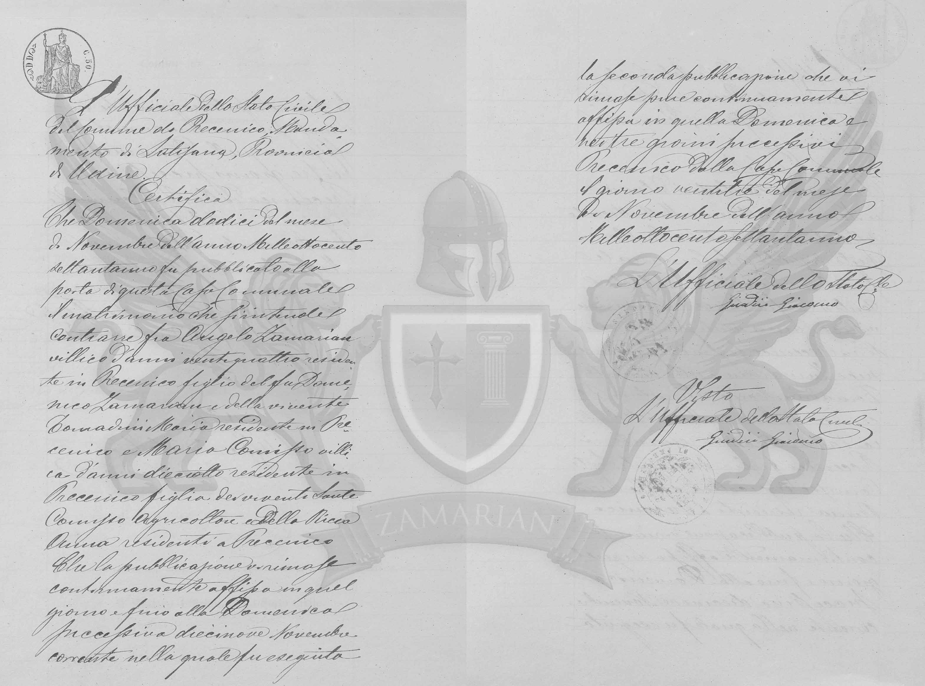 Que Domingo doze do mês de Novembro do ano de Mil oitocentos e setenta e um foi publicado à porta desta Casa Municipal o matrimônio que se entende contrair entre Angelo Zamarian camponês, de vinte e quatro anos, residente em Precenicco filho do finado Domenico Zamarian e da vivente Tomadini Maria residente em Precenicco, e Maria Comisso, camponesa, de dezoito anos, residente em Precenicco filha dos viventes Sante Comisso, agricultor e Della Ricca Anna viventes em Precenicco. Que a publicação permaneceu continuamente afixada daquele dia até o domingo recessivo dezenove de Novembre corrente, na qual foi exibida a segunda publicação que permaneceu da mesma forma continuamente fixada naquele Domingo e nos três dias sucessivos, em Precenicco na Casa Municipal o dia vinte e três do mês de Novembro do ano de mil oitocentos e setenta e um.
