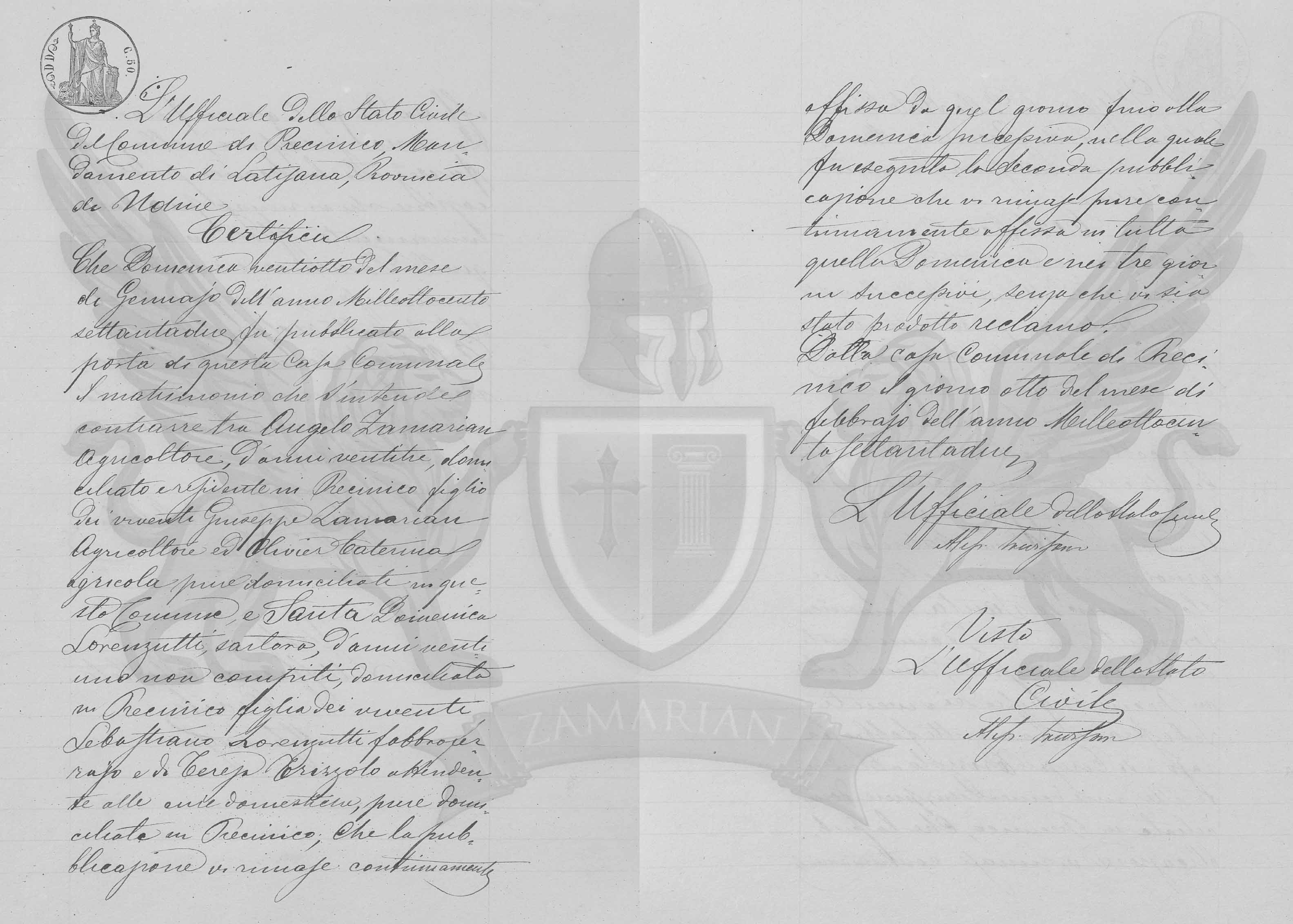 Que Domingo vinte e oito do mês de Janeiro do ano de Mil oitocentos e setenta e dois foi publicado à porta desta Casa Municipal o matrimônio que se entende contrair entre Angelo Zamarian Agricultor, de vinte e três anos, domiciliado e residente em Precenicco filho dos viventes Giuseppe Zamarian Agricultor e de Olivier Caterina Agricultora também domiciliados neste Município, e Santa Domenica Lorenzutti, artesã, de vinte e um anos não completos, domiciliada em Precenicco filha dos viventes Sebastiano e de Teresa Trizzolo atendente aos cuidados domésticos, também domiciliados em Precenicco, que a publicação permaneceu continuamente afixada daquele dia também o Domingo recessivo, na qual foi exibida a Segunda publicação que permaneceu da mesma forma continuamente fixada em todo aquele Domingo e nos três dias sucessivos, sem que tenha produzido reclame.
