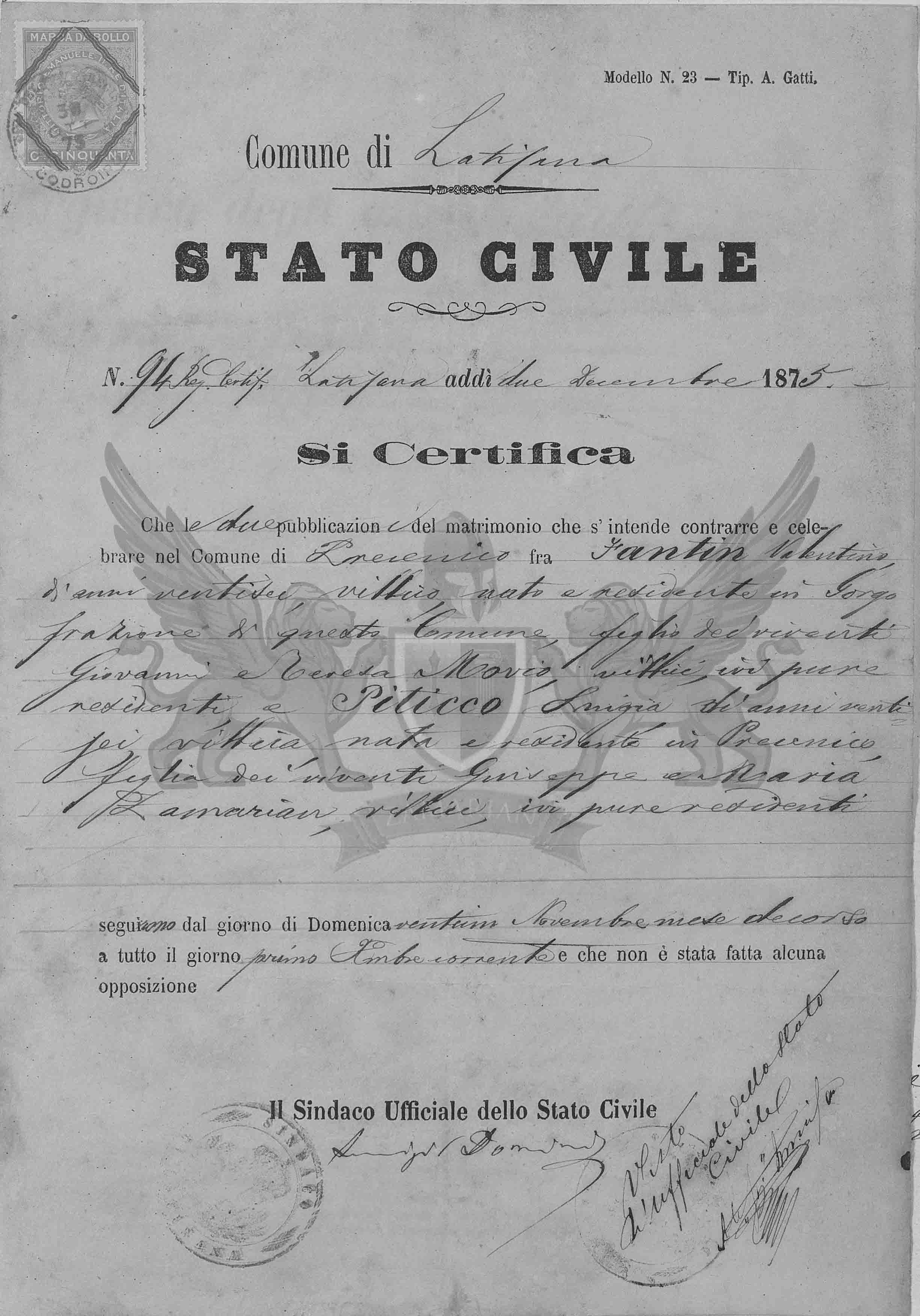 Que as duas publicações de matrimônio que se intende contrair e celebrar no Município de Precenicco entre Fantin Valentino, de vinte e três anos, camponês, nascido e residente em Gorgo, Fração deste Município, filho dos viventes Giovanni e Teresa Movio, camponeses, onde também residentes, e Piticco Luigia, de vinte e seis anos camponesa, nascida e residente em Precenicco, filha dos viventes Giuseppe e Maria Zamarian, camponeses, onde também residentes.