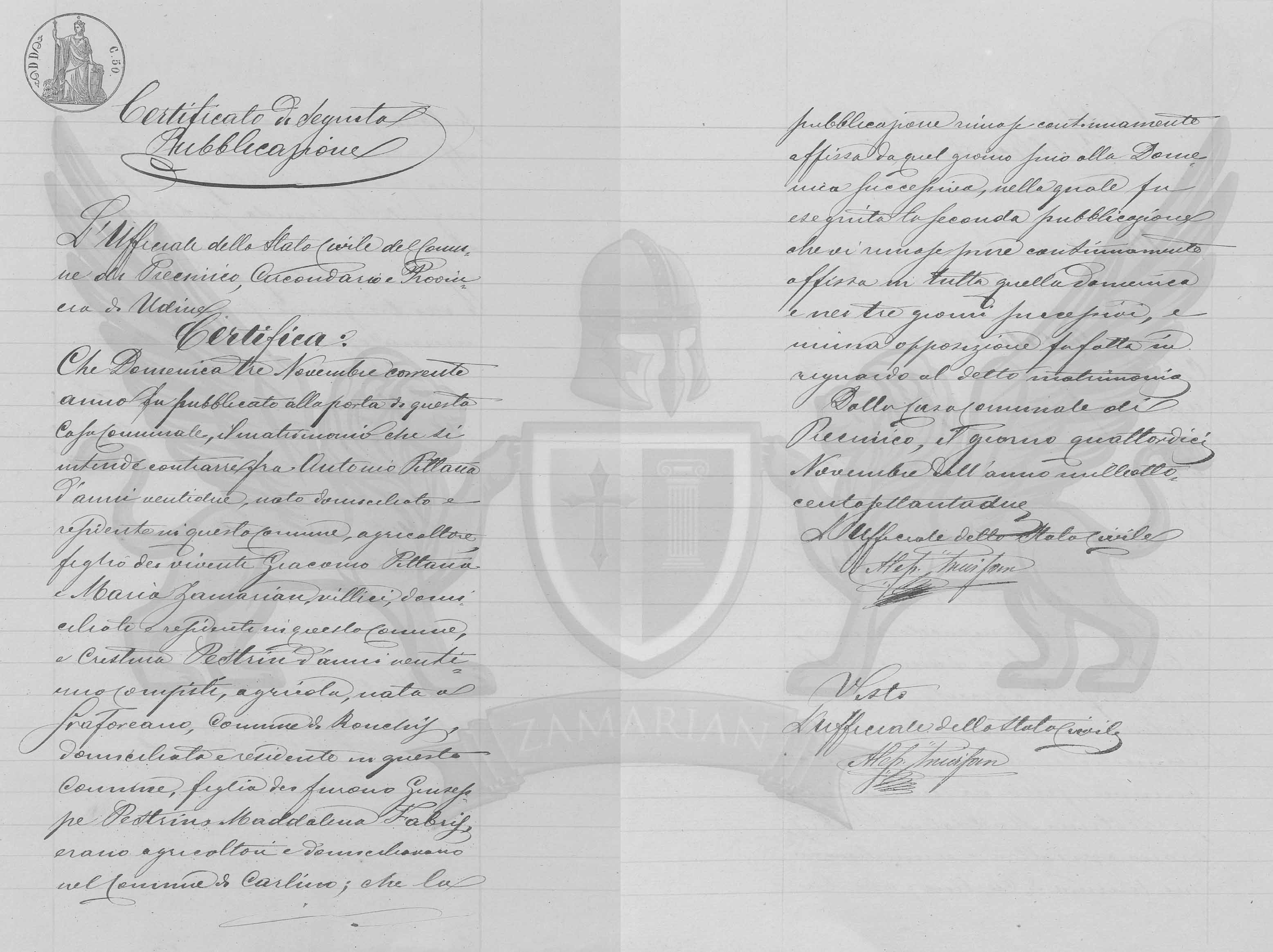 Que Domingo três de Novembro do corrente ano foi publicado à porta desta Casa Municipal o matrimônio que se entende contrair entre: Antonio Pittana, de vinte e dois anos, nascido domiciliado e residente neste Município filho dos viventes Giacomo Pittana e Maria Zamarian, camponeses domiciliados e residentes neste Município; e Cristina Pestrin, de vinte e um anos completos, agricultora, nascida em Fraforeano, Município de Ronchis, domiciliada e residente neste Município, filha dos finados Giuseppe Pestrin e Maddale Fabris, eram agricultores, e domiciliados no Município de Carlino; que a publicação permaneceu continuamente afixada daquele dia até o domingo sucessivo, na qual foi exibida a segunda publicação que da mesma forma permaneceu continuamente fixada em todo aquele domingo e nos três dias sucessivos, e nenhuma oposição foi feita em relação ao matrimônio.