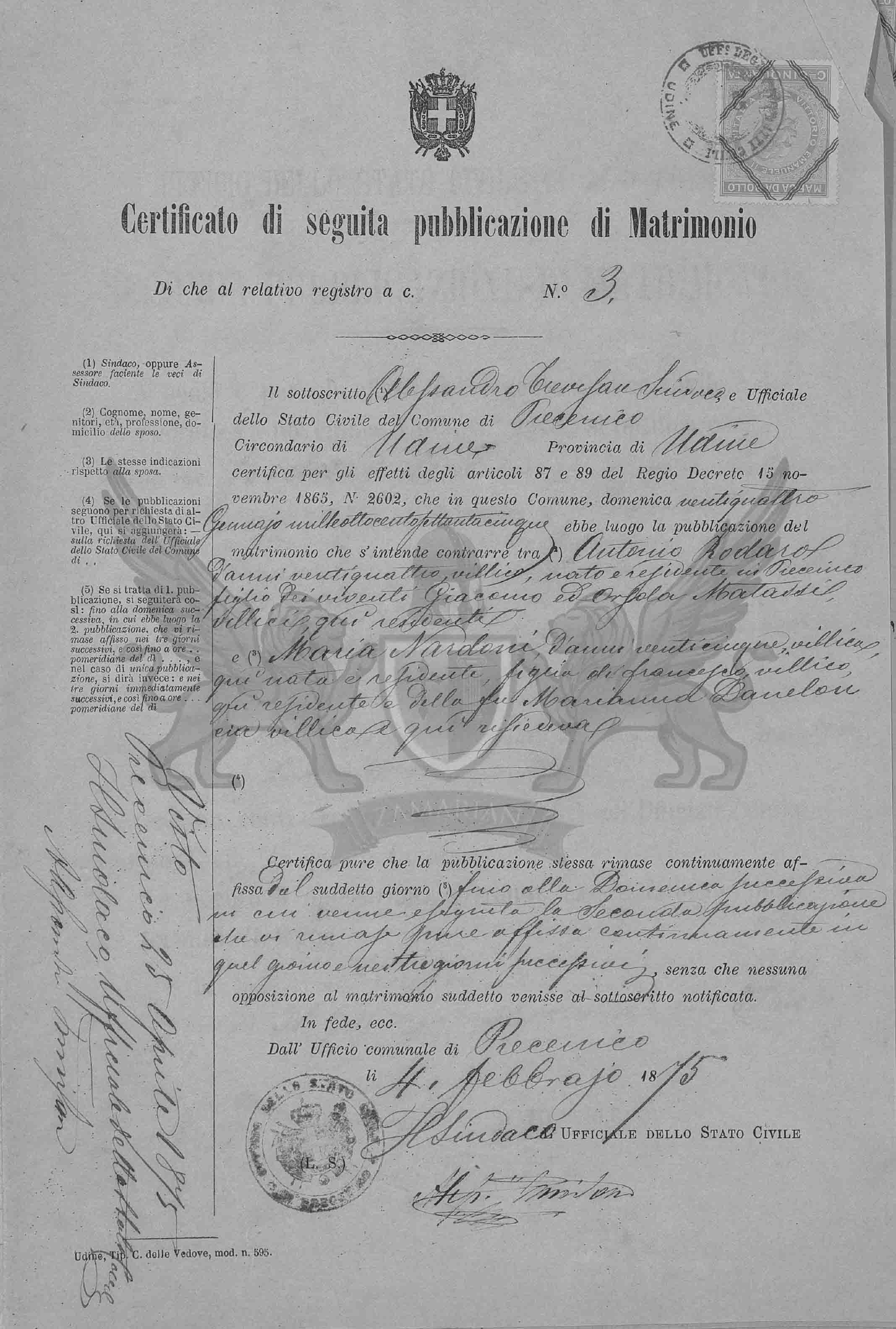 O subscrito Alessandro Trevisan Síndico e Oficial do Estado Civil do Município de Precenicco Circundário de Udine Província de Udine certifica para os efeitos dos artigos 87 e 89 do Regio Decreto de 15 de novembro de 1865, N 2602, que neste Município, domingo vinte e quatro de janeiro de mil oitocentos e setenta e cinco exibe lugar a publicação do matrimônio que se intende contrair entre Antonio Rodaro de vinte e quatro anos, camponês nascido e residente em Precenicco filho dos viventes Giacomo e Orsola Matassi, camponeses e aqui residentes e Maria Nardoni, de vinte e cinco anos camponesa, aqui nascida e residente, filha de Francesco, camponês, aqui residente e da falecida Marianna Danelon, era camponesa e aqui residia.