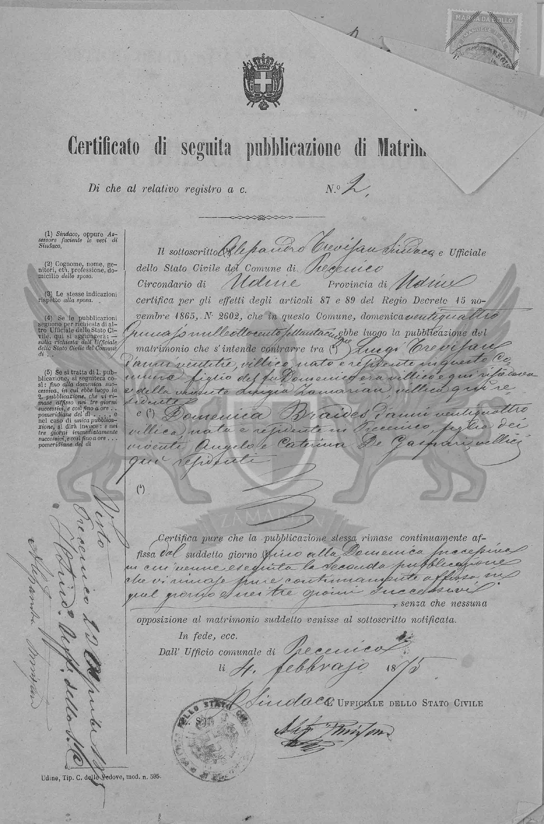 O subscrito Alessandro Trevisan Síndico e Oficial do Estado Civil do Município de Precenicco Circundario de Udine Província de Udine certifica para os efeitos dos artigos 87 e 89 do Regio Decreto de 15 de novembro de 1865, N 2602, que neste Município, domingo vinte e quatro de janeiro de mil oitocentos e setenta e cinco exibe lugar a publicação do matrimônio que se intende contrair entre Luigi Trevisan de vinte e três anos, camponês nascido e residente neste Município filho do falecido Domenico era camponês e aqui residia e da vivente Luigia Zamarian, camponesa aqui residente e Domenica Braides, de vinte e quatro anos camponesa, nascida e residente em Precenicco, filha dos viventes Angelo e Caterina De Gasperi, camponeses aqui residentes.