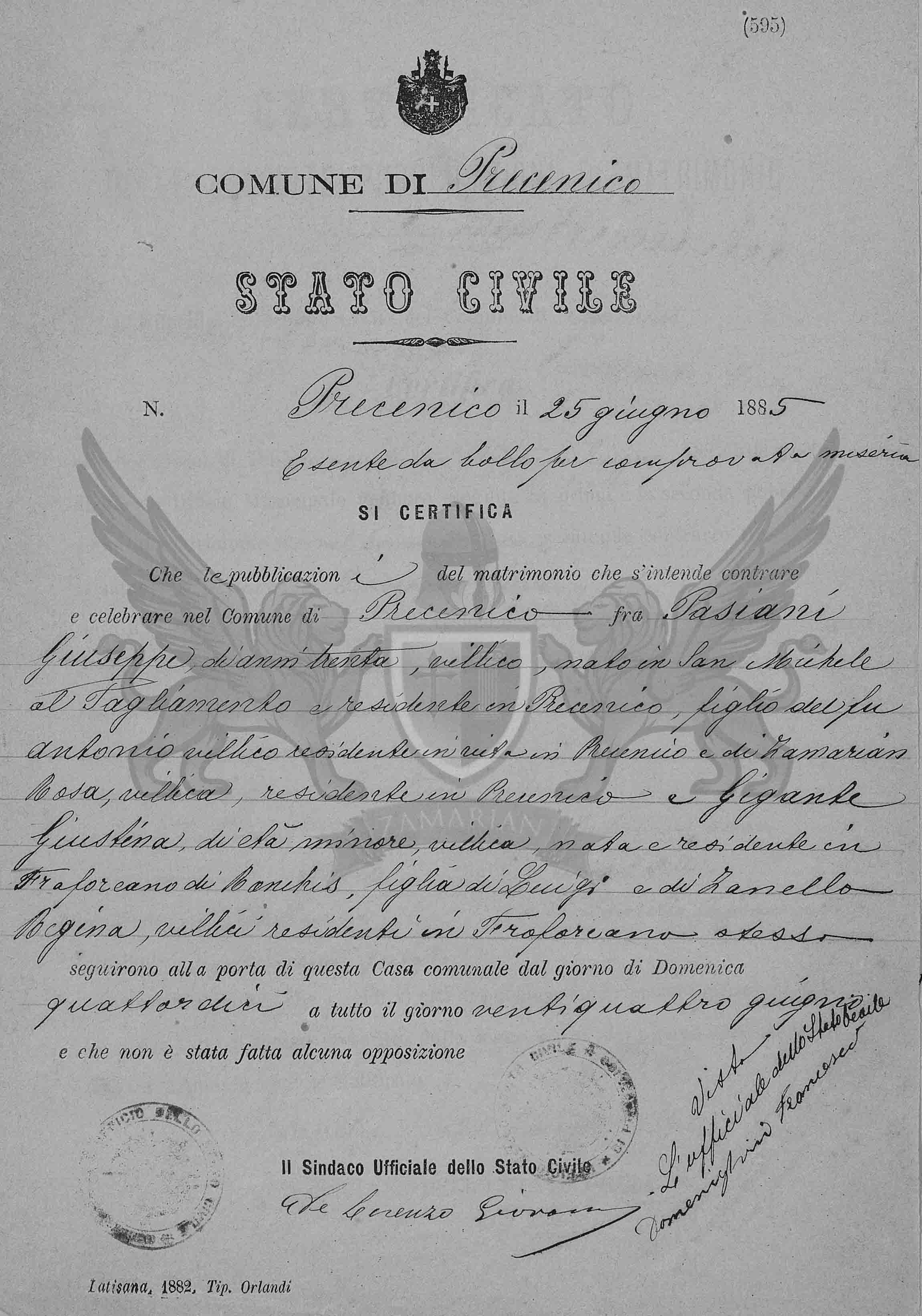 Que as publicações de matrimônio que se intende contrair e celebrar no Município de Precenicco entre Pasiani Giuseppe, de 30 anos de idade, camponês, nascido em San Michele al Taglimento, residente em Precenicco, filho do falecido Antonio, camponês, residente em vida em Precenicco e de Zamarian Rosa, camponesa, residente em Precenicco, e Giganti Giustina, de idade menor, camponesa, nascida e residente em Fraforeano de Ronchis, filha de Luigi e Zanello Regina, camponeses, residentes na mesma Fraforeano, seguiram à porta desta Casa Municipal do dia de Domingo quatorze a todo o dia vinte vinte e quatro de junho de 1885 e que não fora feita alguma oposição