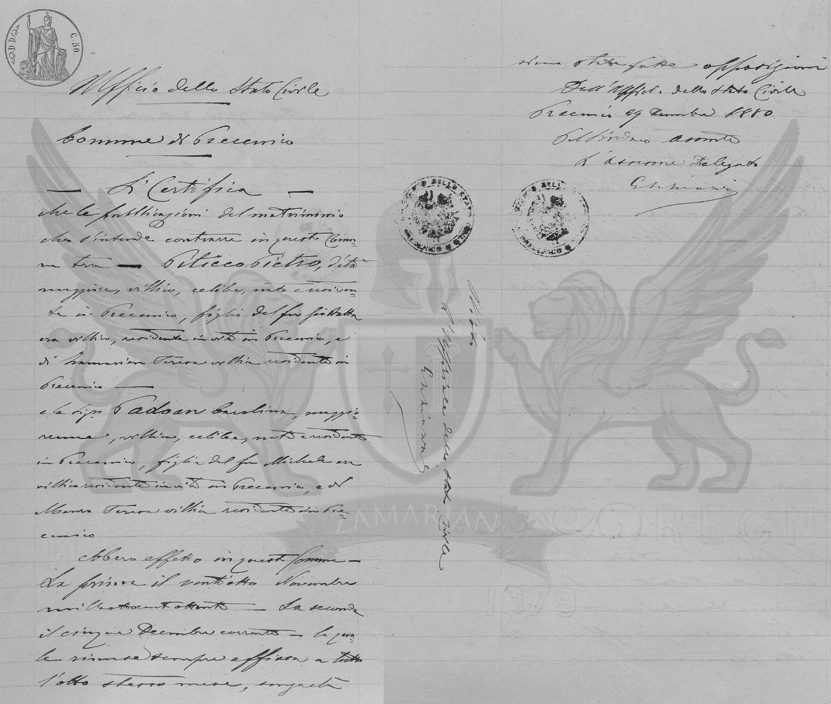 Que as publicações de matrimônio que se intende contrair neste Município entre Piticco Pietro, de idade maior, camponês, solteiro, nascido e residente em Precenicco, filho do falecido Giovanni Battista era camponês, residente em vida em Precenicco, e de Zamarian Teresa camponesa, residente em Precenicco e a Senhora Padovan Carolina, maior de idade, nascida em Morsano al Tagliamento, residente em Precenicco, camponesa, solteira, filha do falecido Michele era camponês residente em vida em Precenicco, e de Mauro Teresa camponesa residente em Precenicco tiveram efeito neste Município a primeira no dia vinte e oito de novembro de mil oitocentos e oitenta e a segunda no dia cinco de dezembro corrente a qual permaneceu sempre afixada até o final do dia oito do mesmo mês, sem que tenha ocorrido nenhuma oposição.