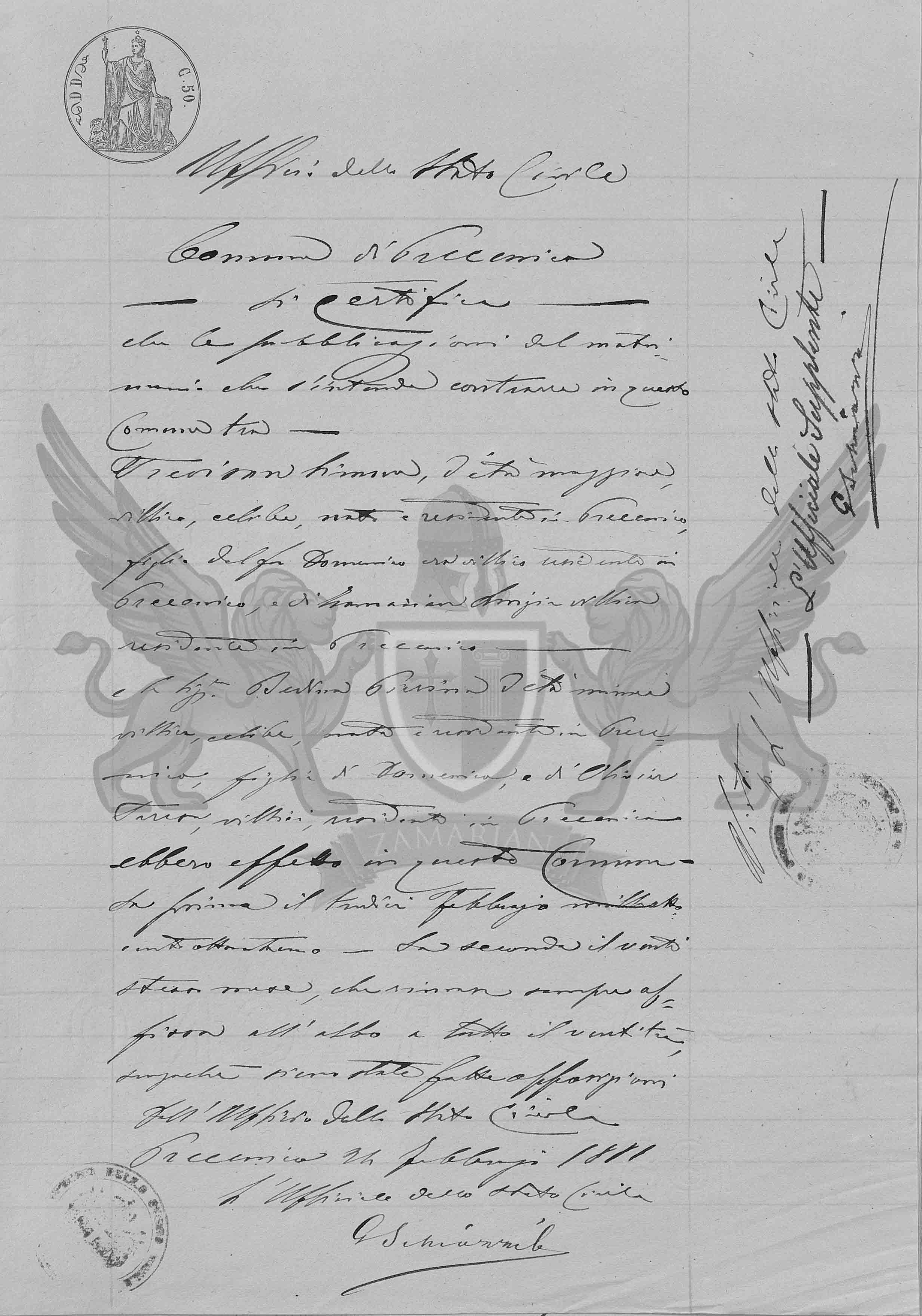 Que as publicações de matrimônio que se intende contrair neste Município entre Trevisan Simone de idade maior camponês, solteiro, nascido e residente em Precenicco, filho do falecido Domenico era camponês residente em vida em Precenicco, e de Zamarian Luigia camponês residente em Precenicco e a Senhora Bedina Pierina de idade menor camponesa, solteira, nascida e residente em Precenicco, filha de Domenico, e de Olivier Teresa camponeses residentes em Precenicco, tiveram efeito neste Município a primeira no dia treze de fevereiro de mil oitocentos e oitenta e um, a segunda no dia vinte do mesmo mês a qual permaneceu sempre afixada até o final do dia vinte e três, sem que tenha ocorrido nenhuma oposição.