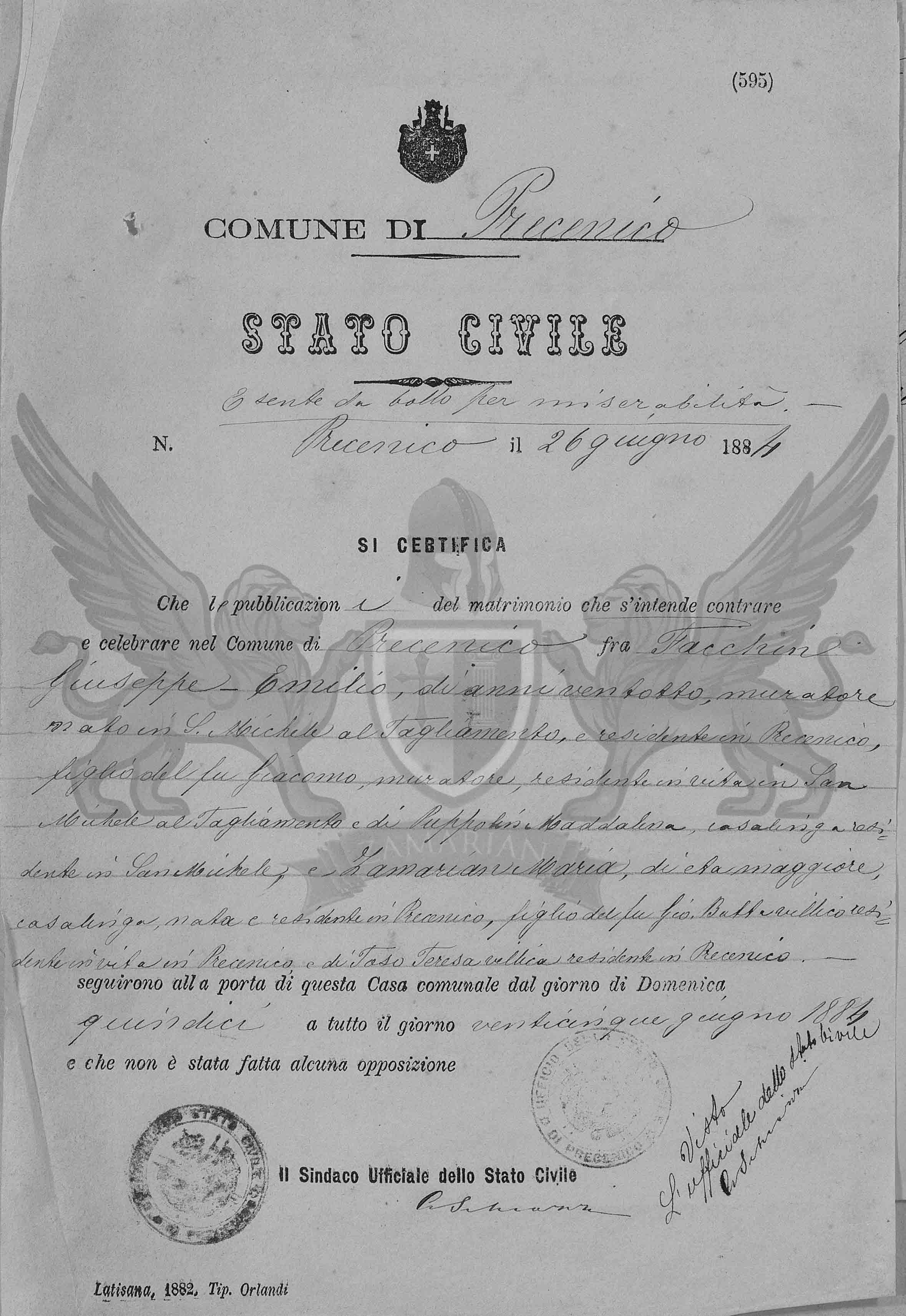 Que as publicações de matrimônio que se intende contrair e celebrar no Município de Precenicco entre Facchin Giuseppe Emilio, de vinte e oito anos, construtor, nascido em San Michele al Tagliamento, e residente em Precenicco, filho do falecido Giacomo, construtor, residente em vida em San Michele al Tagliamento e de Puppolin Maddalena, dona de casa, residente em San Michele al Tagliamento, e Zamarian Maria, de idade maior, dona de casa, nascia e residente em Precenicco, filha do falecido Giovanni Battista, camponês residente em vida em Precenicco e de Toso Teresa, camponesa, residente em Precenicco, seguiram à porta desta Casa Municipal do dia de Domingo quinze a todo o dia vinte e cinco de junho de 1884 e que não fora feita alguma oposição