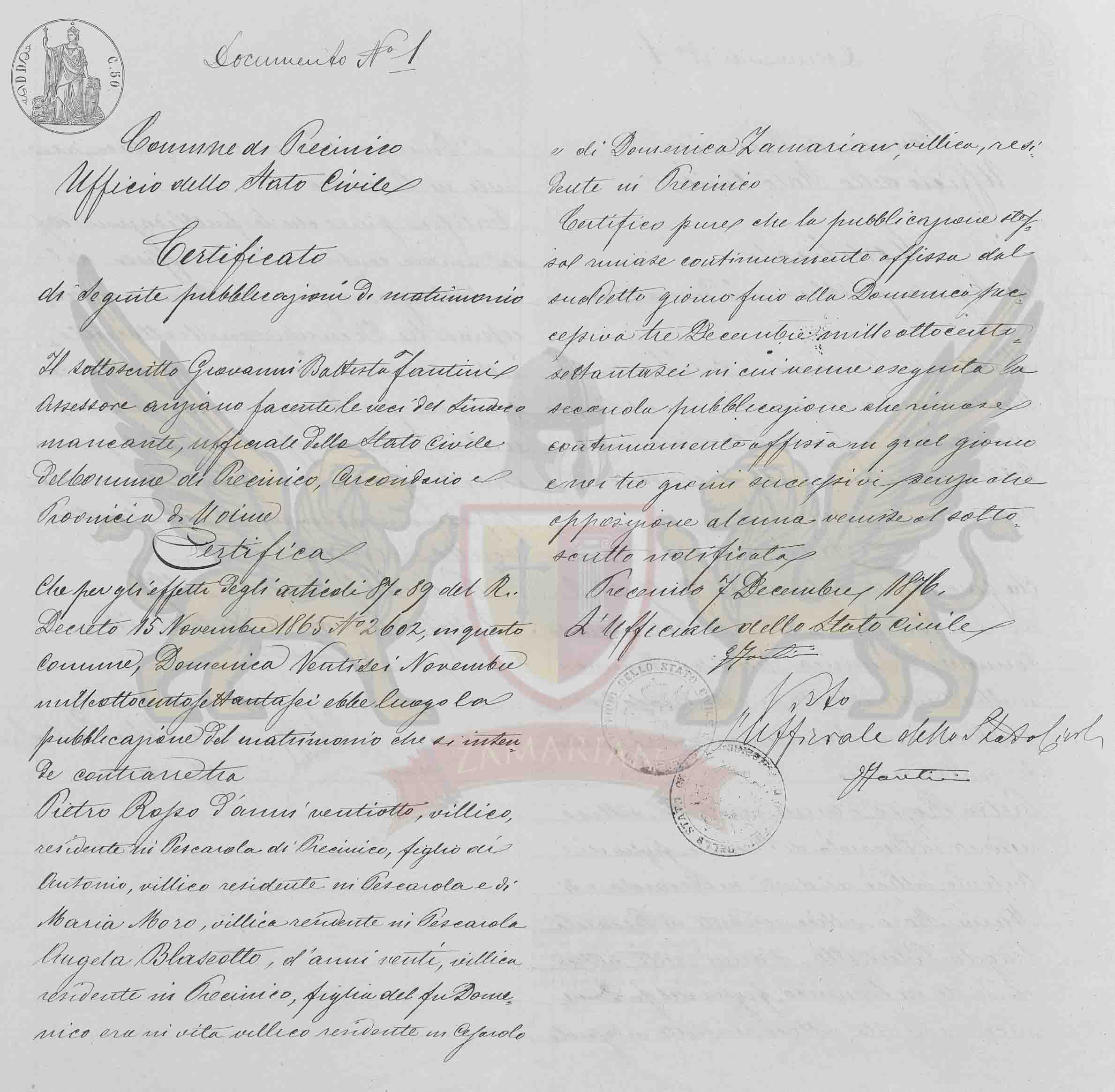 Que para os efeitos dos artigos 87 e 89 do Regio Decreto de 15 de novembro de 1865, N 2602, neste Município, Domingo vinte e seis de novembro de mil oitocentos e setenta e seis exibe lugar a publicação do matrimônio que se intende contrair entre Pietro Rosso de vinte e oito anos, camponês, residente em Pescarola de Precenicco, filho de Antonio, camponês residente em Pescarola e de Maria Moro, camponesa residente em Pescarola Angela Blaseotto, de vinte anos, camponesa residente em Precenicco, filha do falecido Domenico era em vida residente em Cesarolo e de Domenica Zamarian, camponesa, residente em Precenicco.