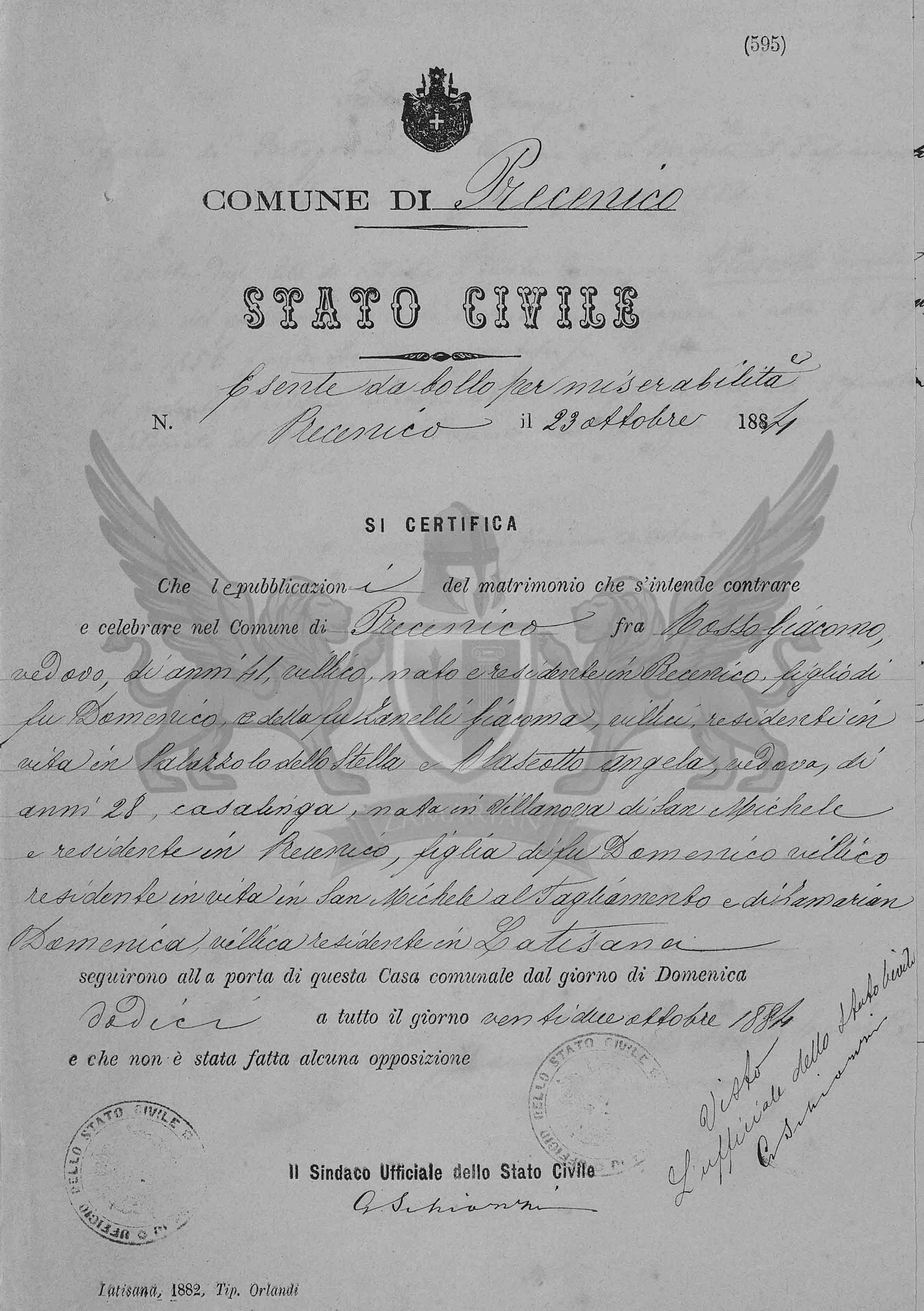 Que as publicações do matrimônio que se intende contrair e celebrar no Município de Precenicco entre Rosso Giacomo, viúvo, de 41 anos, camponês, nascido e residente em Precenicco filho do falecido Domenico e da falecida Zanelli Giacoma, camponeses, residentes em vida em Palazzolo dello Stella e Blaseotto Angela, viúva, de 28 anos, dona de casa, nascida em Villanova de San Michele e residente em Precenicco, filha do falecido Domenico, camponês, residente em vida eem San Michele al Tagliamento e de Zamarian Domenica, camponesa, residente em Latisana seguiram à porta desta Casa municipal do dia de Domenico doze a todo o dia vinte e dois de outubro de 1884 e que não foi feita alguma oposição