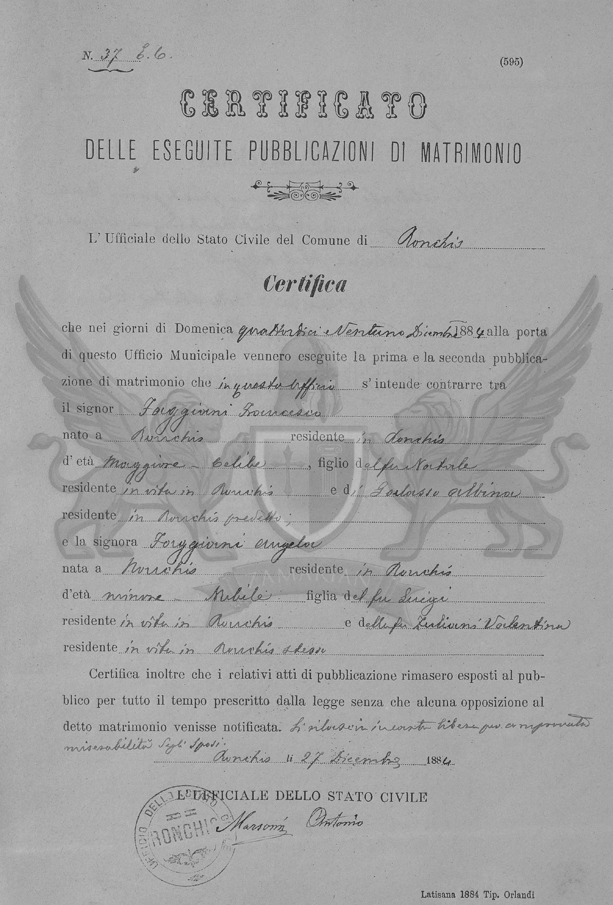 que nos dias de Domingo quatorze e vinte e um de Dezembro de 1884 à porta deste Ofício Municipal vieram exibidas a primeira e segunda publicação de matrimônio que neste ofício se intende contrair entre o senhor Faggiani Francesco nascido em Ronchis residente em Ronchis de idade maior, solteiro, filho do finado Natale residente em Ronchis e de Galasso Albina residente em Ronchis pré citado e a senhora Faggiani Angela nascida em Ronchis residente em Ronchis mesmo.