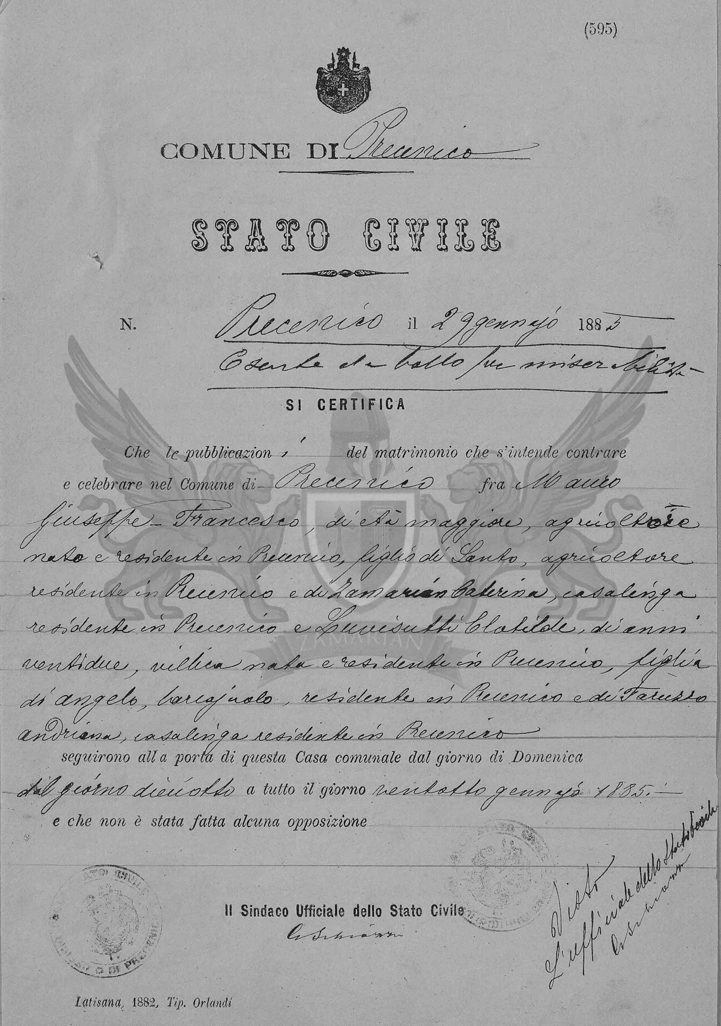 Que as publicações de matrimônio que se intende contrair e celebrar no Município de Precenicco entre Mauro Giuseppe Francesco, de idade maior, agricultor, nascido e residente em Precenicco, filho de Santo, agricultor, residente em Precenicco e de Zamarian Caterina, dona de casa, residente em Precenicco, e Luvisutti Clotilde, de vinte e dois anos, camponesa, nascida e residente em Precenicco, filha de Angelo, barqueiro, residente em Precenicco e de Faruzzo Andriana, dona de casa, residente em Precenicco, seguiram à porta desta Casa Municipal do dia de Domingo dezoito a todo o dia vinte e oito de janeiro de 1885 e que não fora feita alguma oposição