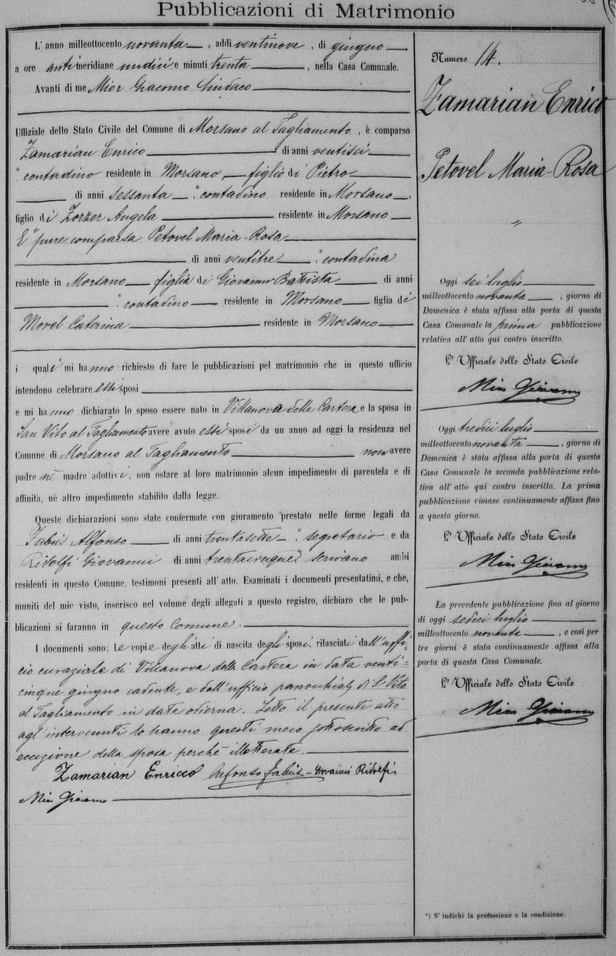 Diante de mim Mior Giacomo Síndico Oficial do Registro Civil do Município de Morsano al Tagliamento compareceu Zamarian Enrico, de vinte e seis anos, *camponês, residente em Morsano, filho de Pietro, de sessenta anos, camponês, residente em Morsano, filho de Zorzer Angela, residente em Morsano; Também compareceu Petovel Maria-Rosa, de vinte e três anos, *camponesa, residente em Morsano, filha de Giovanni Battista, camponês residente em Morsano e, filha de Morel Caterina, residente em Morsano, os quais me pediram para fazer as publicações para o matrimônio que neste ofício pretendem celebrar esses nubentes e me declararam o nubente ter nascido em Villanova della Cartera, a nubente em San Vito al Tagliamento, terem residência há um ano em Morsano al Tagliamento, não ter pai nem mãe adotivos, não ter nenhum vínculo parental que impeça o matrimônio, nem outro impedimento estabelecido por lei.